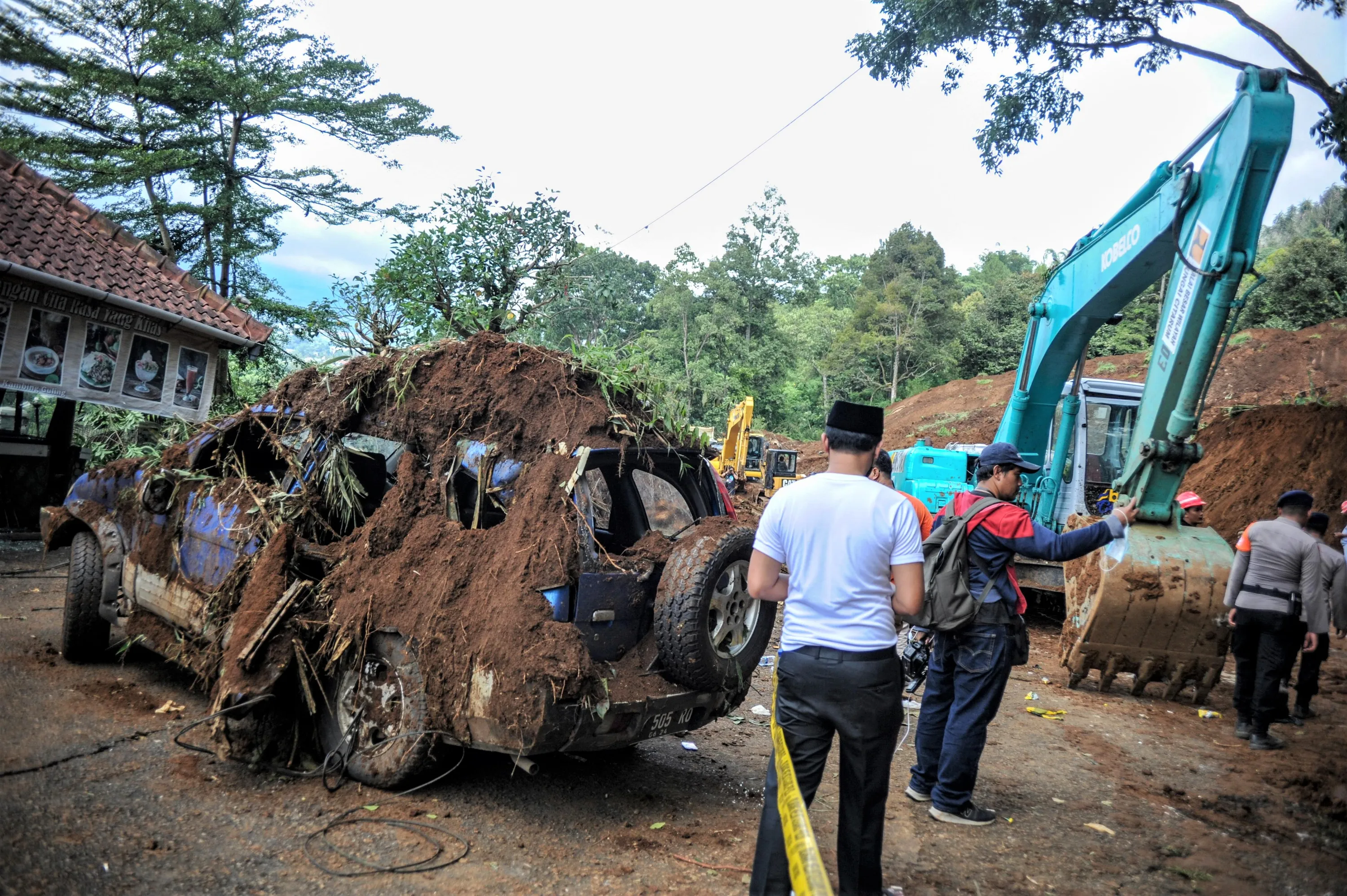 A damaged car is seen on the site of a landslide following earthquake hit in Cianjur, West Java province, Indonesia on November 22, 2022. (Photo by Raisan Al Farisi/Antara Foto)