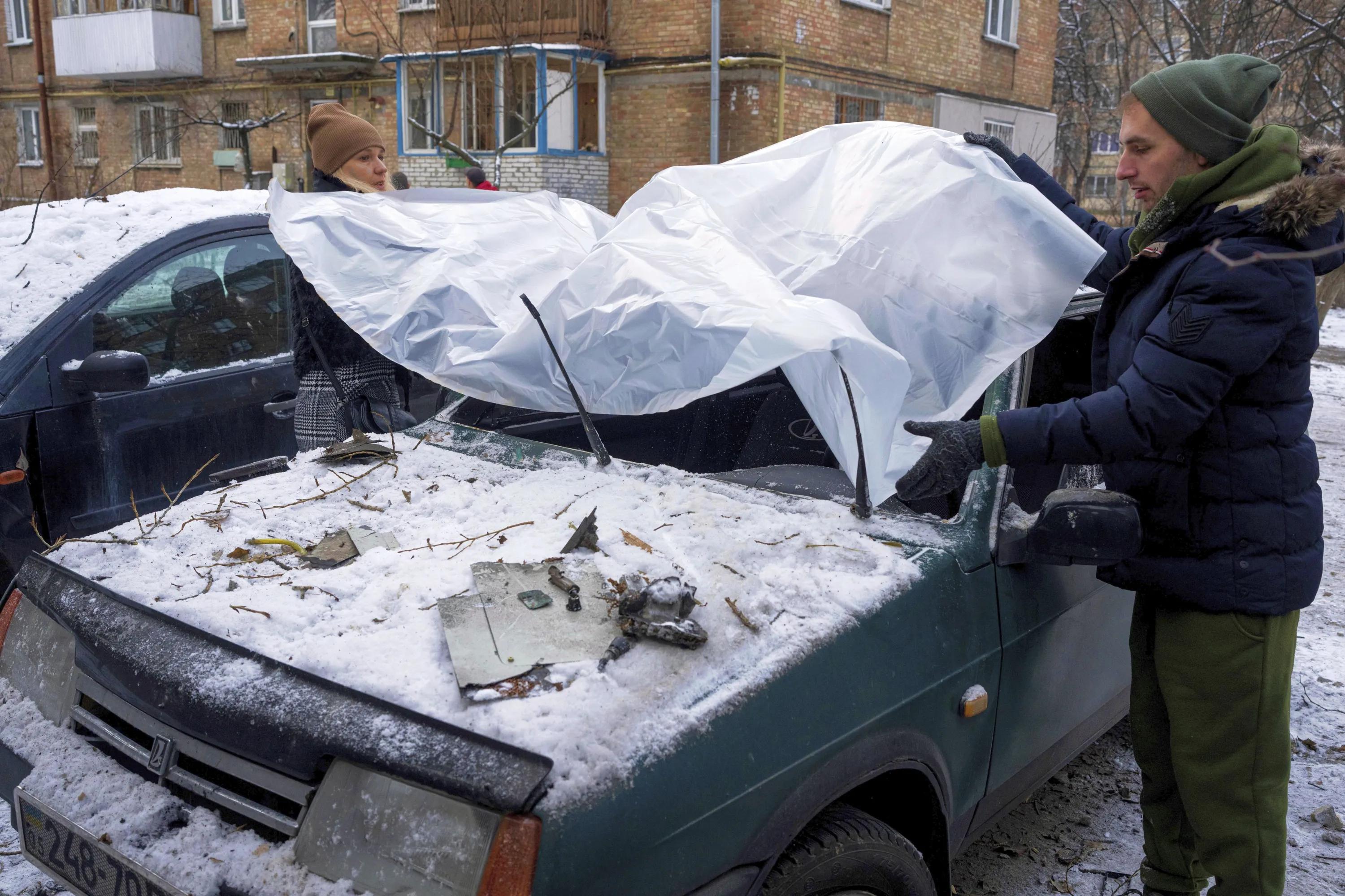 A couple cover their damaged car with a plastic tarp after a Russian attack in Kyiv, Ukraine, Wednesday, December 14, 2022. (Photo by Evgeniy Maloletka/AP Photo)