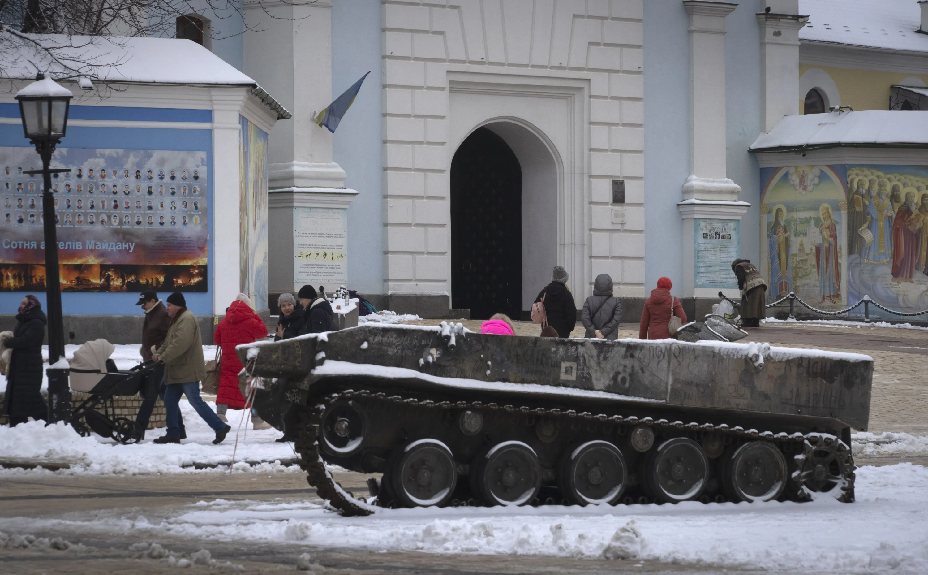 People pass by the entrance to St.Michael Cathedral, with a damaged Russian military vehicle in the foreground, in central Kyiv, Ukraine, Monday, December 12, 2022. Ukraine has been fighting with the Russian invaders since Feb. 24 for over nine months. (Photo by Efrem Lukatsky/AP Photo)
