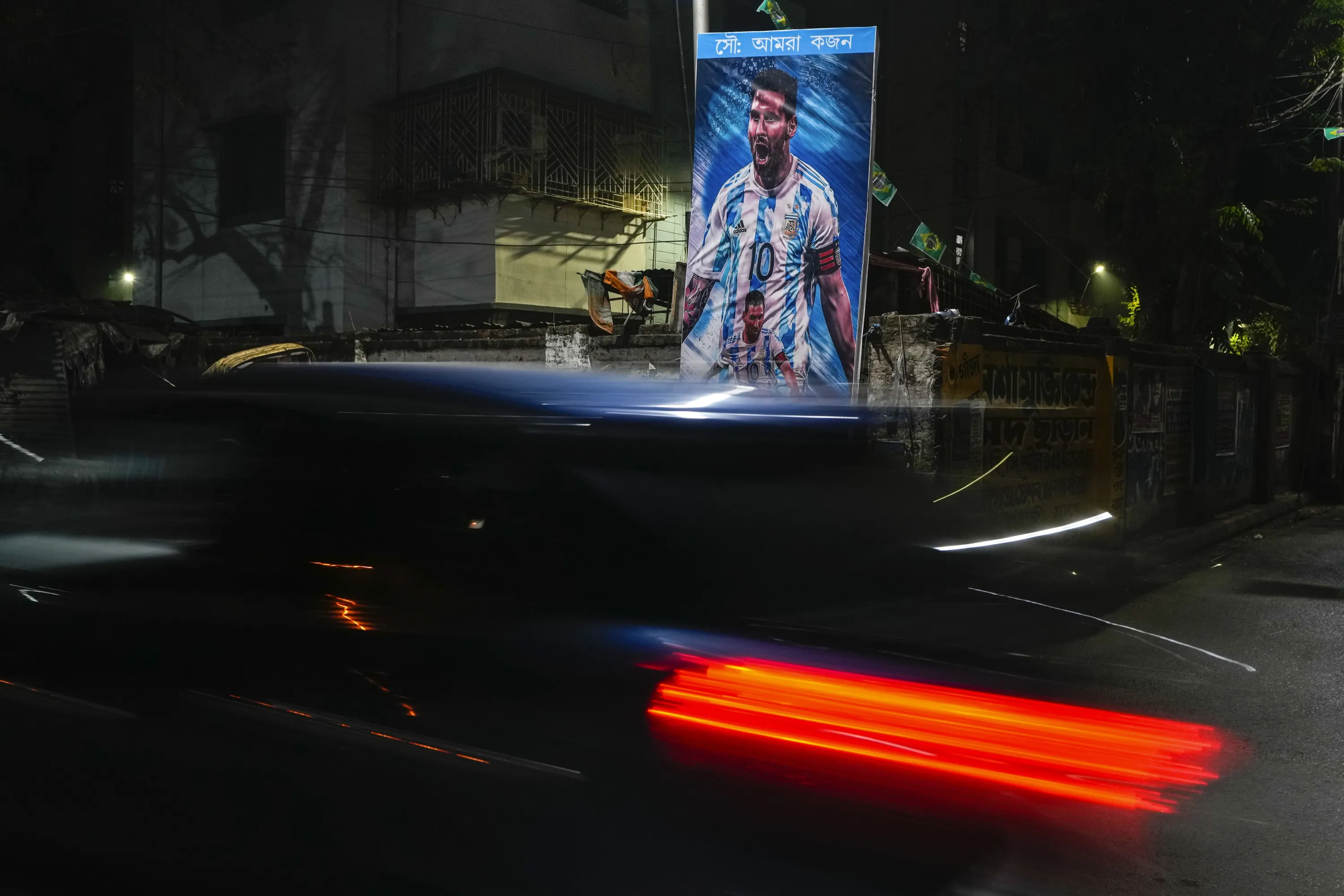 A car passes a poster of Argentina's Leonel Messi, erected by the Indian fans of Argentina during the World Cup semi final soccer match between Argentina and Croatia in Qatar, Wednesday, December 14, 2022. Argentina defeated Croatia 3-0. (Photo by Bikas Das/AP Photo)