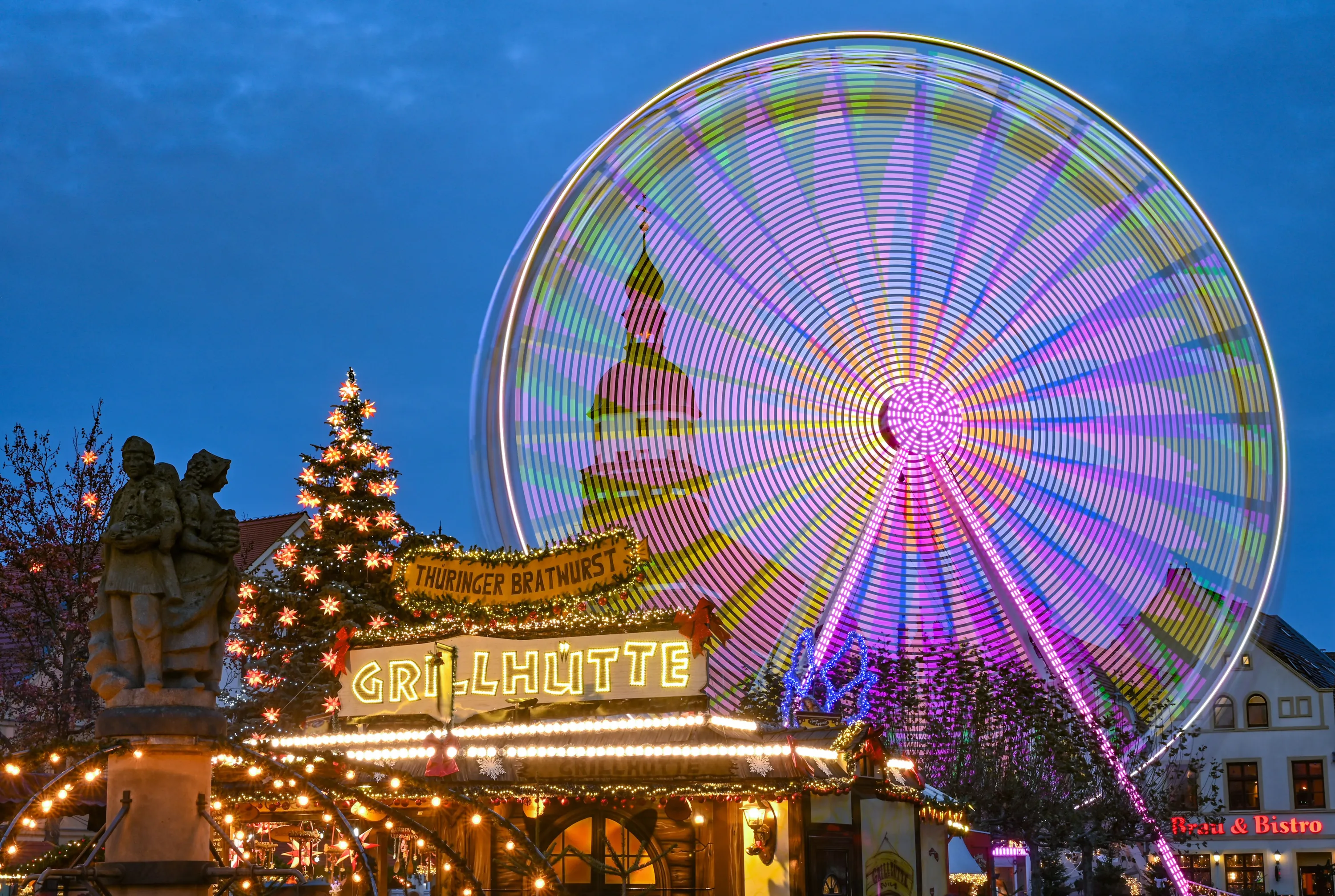 A Ferris wheel and a pyramid rotate at the Cottbus on November 28, 2022 Christmas market of 1000 stars in the late afternoon (shot with long exposure). This Christmas market on the Altmarkt in Cottbus city center is still open until 23.12.2022. (Photo by Patrick Pleul/Avalon)