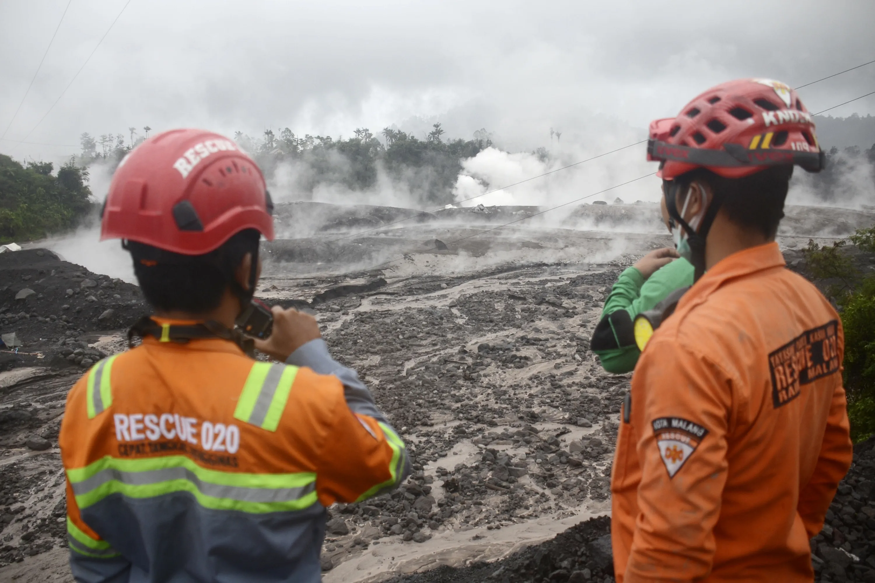 Rescuers monitor the flow of volcanic materials from the eruption of Mount Semeru, in Lumajang, East Java, Indonesia, Sunday, December 4, 2022. Indonesia's highest volcano on its most densely populated island released searing gas clouds and rivers of lava Sunday in its latest eruption. (Photo by Hendra Permana/AP Photo)