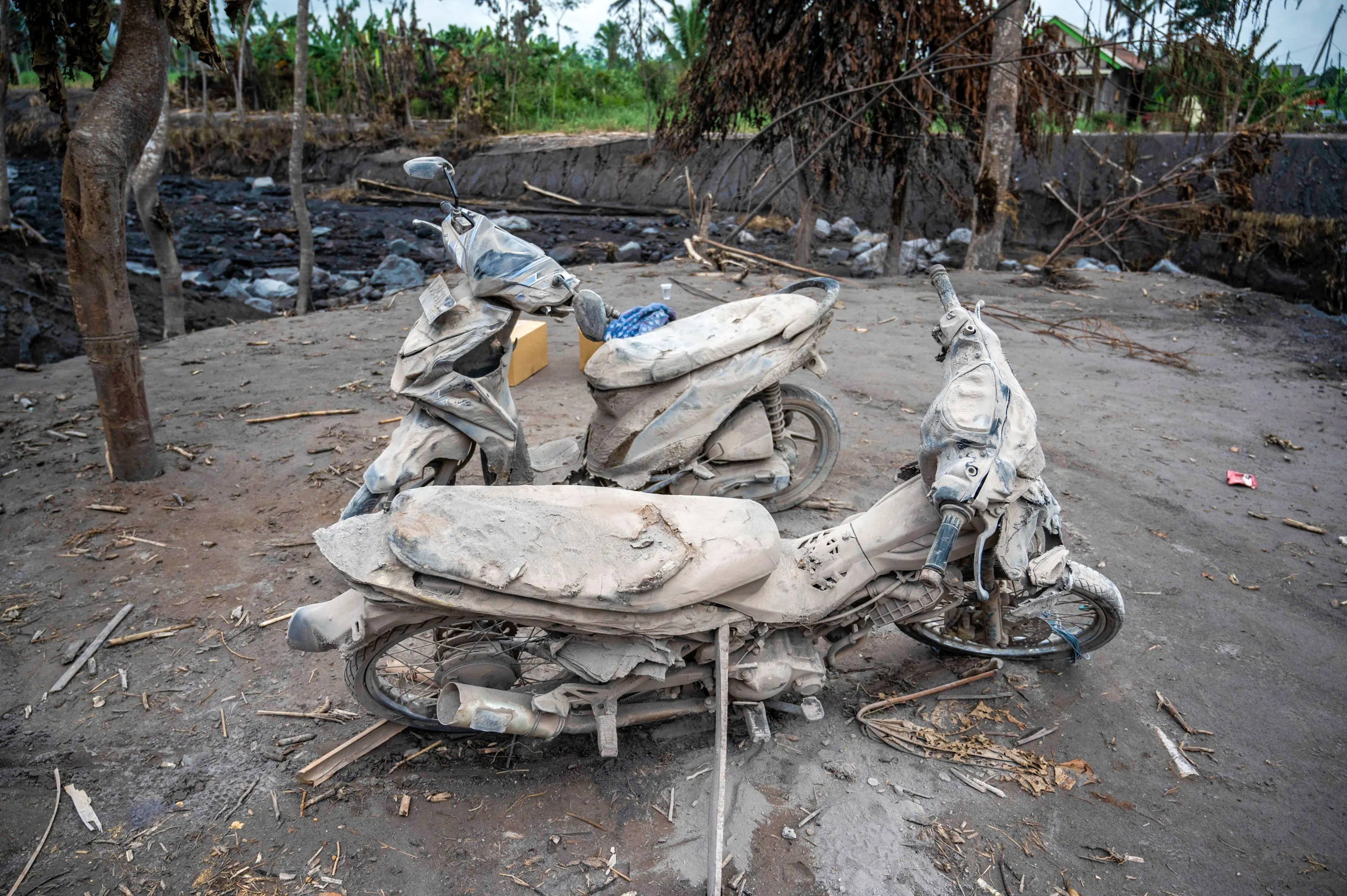 Damaged motorcyles are covered in ash at Kajar Kuning village in Lumajang on December 7, 2022, following the volcanic eruption of mount Semeru on December 4. (Photo by Juni Kriswanto/AFP Photo)