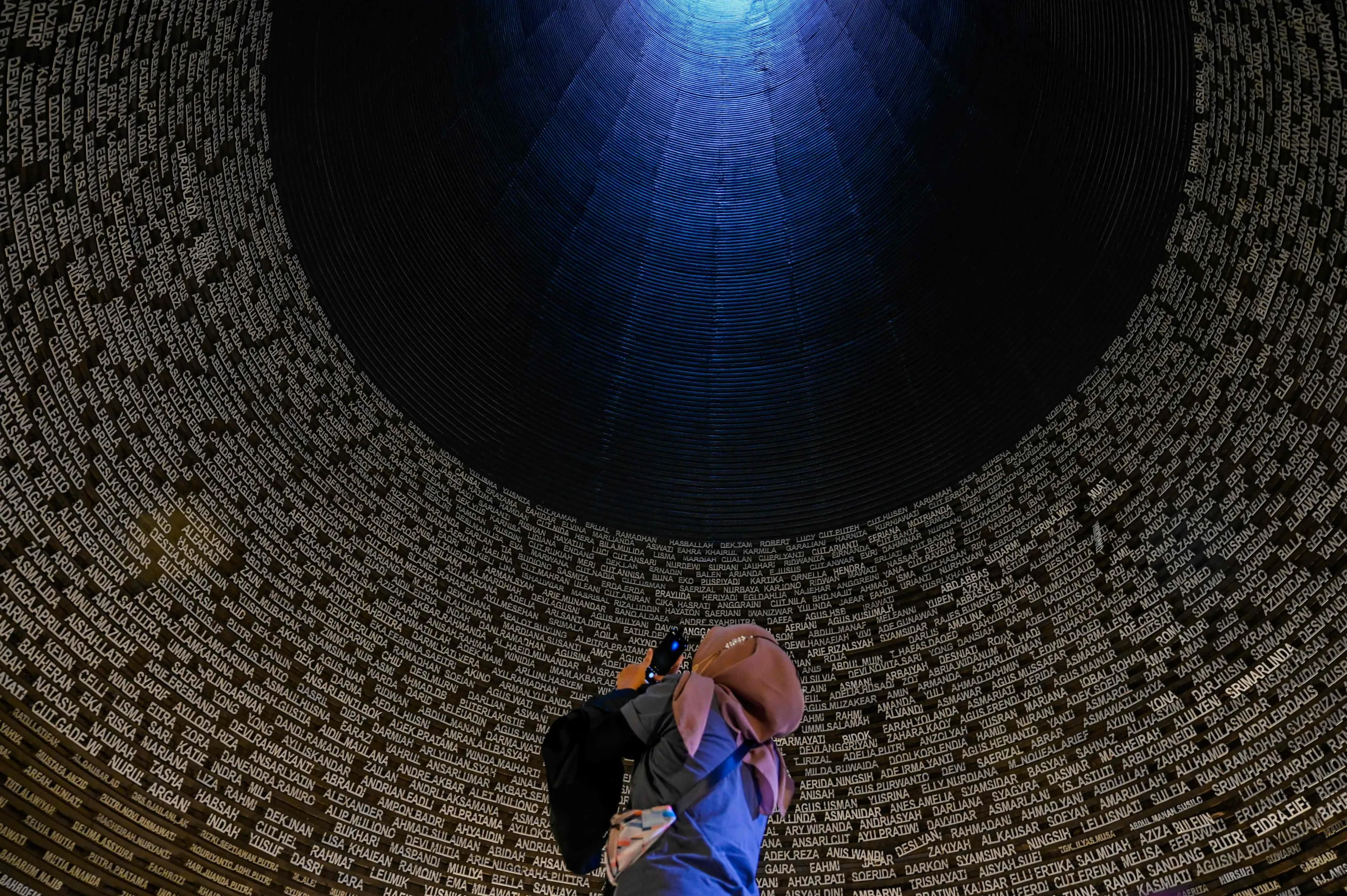 A woman takes photos of a list of victim names at the Tsunami Museum ahead of the 2004 Boxing Day tsunami anniversary, in Banda Aceh on December 8, 2022. (Photo by Chaideer Mahyuddin/AFP Photo)
