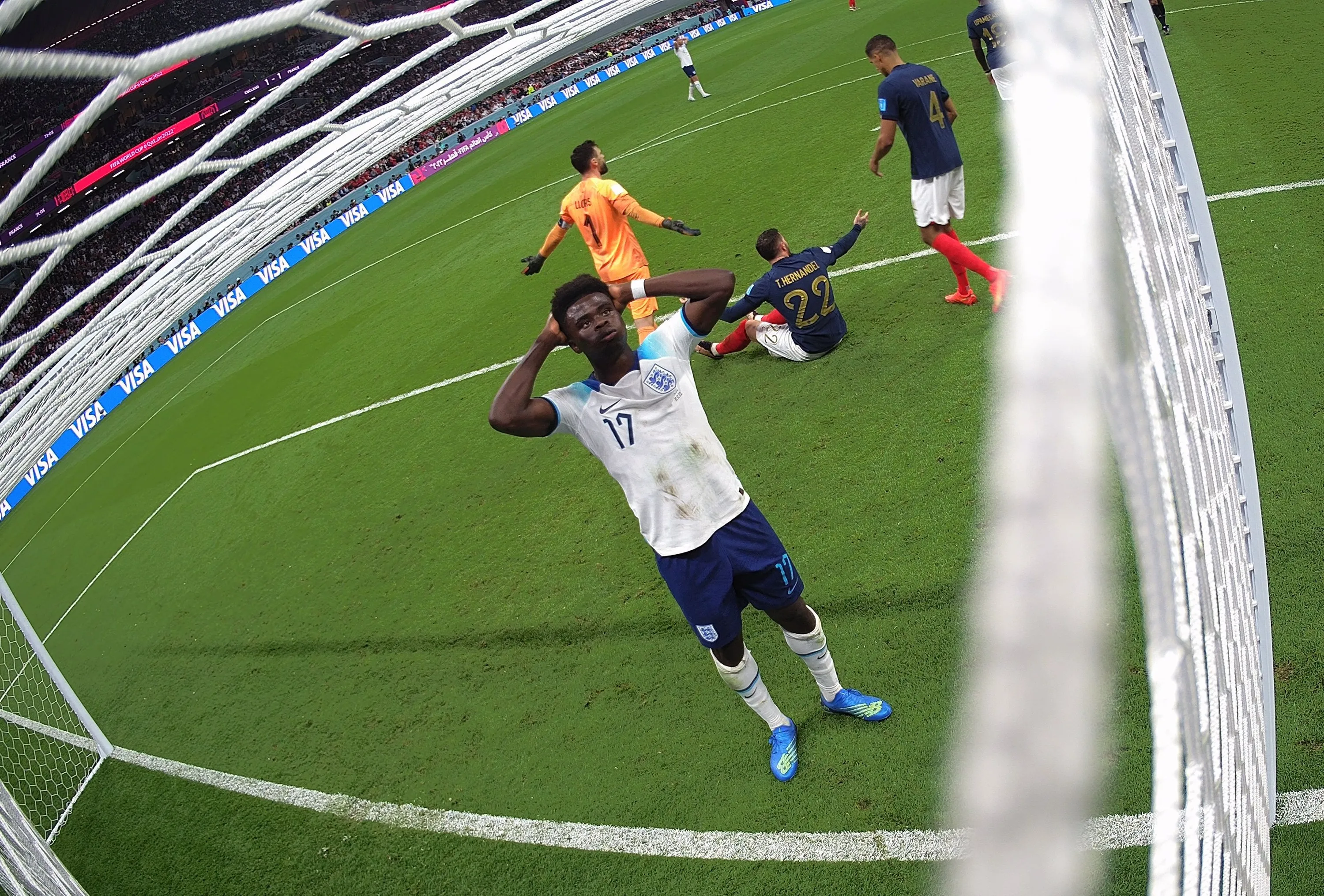 England's forward #17 Bukayo Saka reacts next to France's goalkeeper #01 Hugo Lloris after a missed chance during the Qatar 2022 World Cup quarter-final football match between England and France at the Al-Bayt Stadium in Al Khor, north of Doha, on December 10, 2022. (Photo by Anne-Christine Poujoulat/AFP Photo)