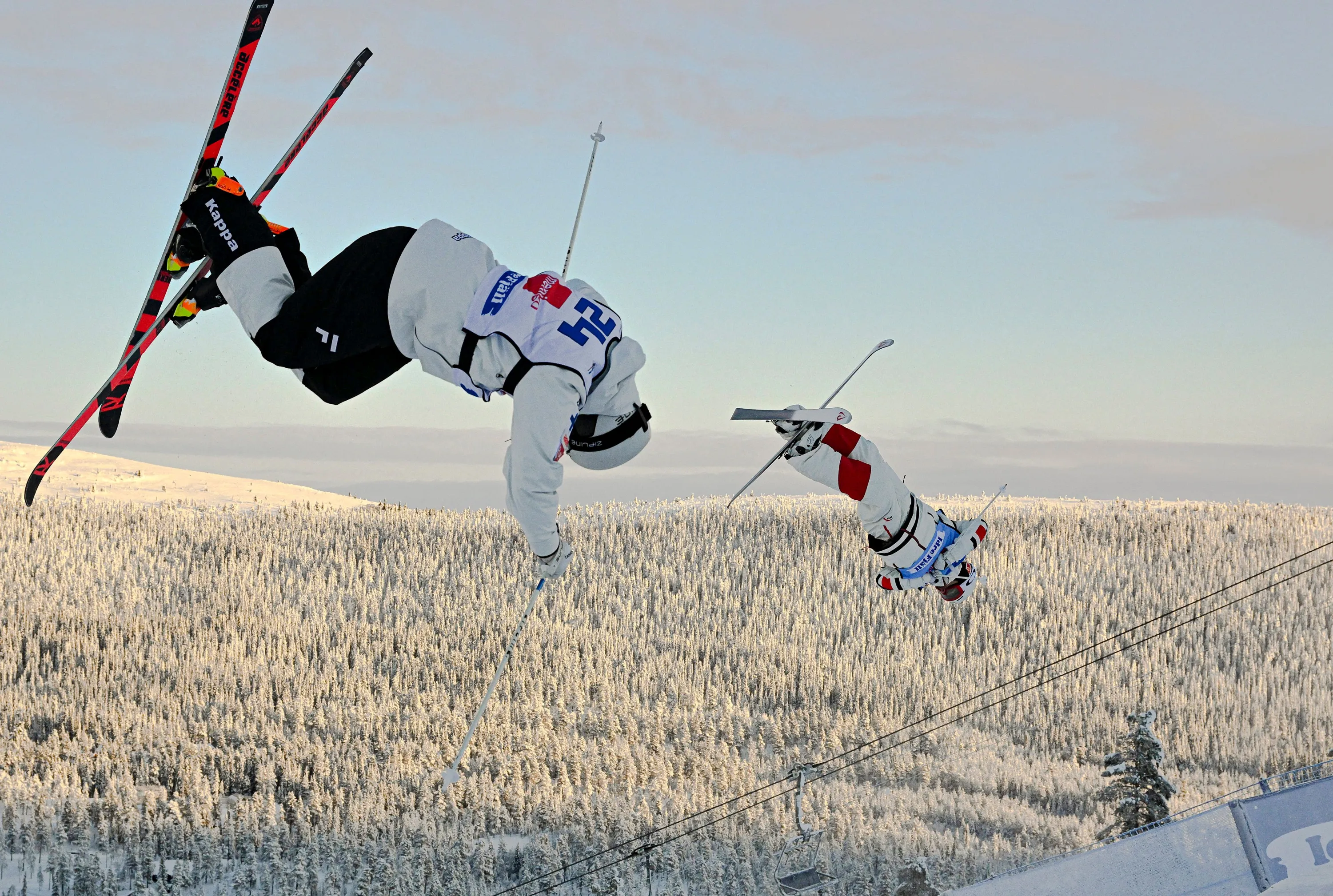 Canada's Mikael Kingsbury (R) and Finland's Severi Vierela compete during the FIS Freestyle Ski World Cup in Idre Fjall, Sweden, on December 11, 2022. (Photo by Nisse Schmidt/TT News Agency via AFP Photo)