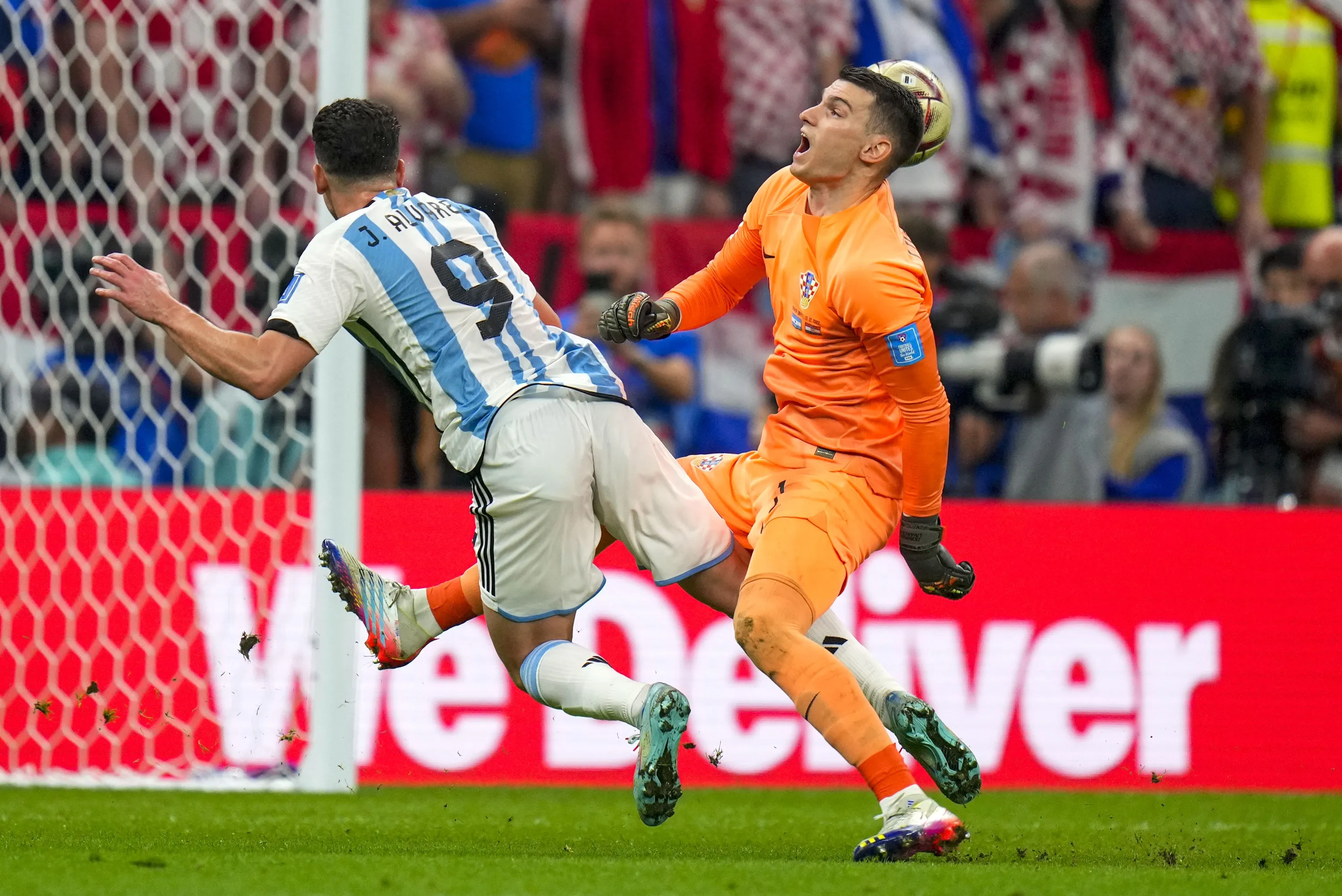 Argentina's Julian Alvarez, left, is fouled by Croatia's goalkeeper Dominik Livakovic and awarded a penalty during the World Cup semifinal soccer match between Argentina and Croatia at the Lusail Stadium in Lusail, Qatar, Tuesday, December 13, 2022. (Photo by Petr David Josek/AP Photo)