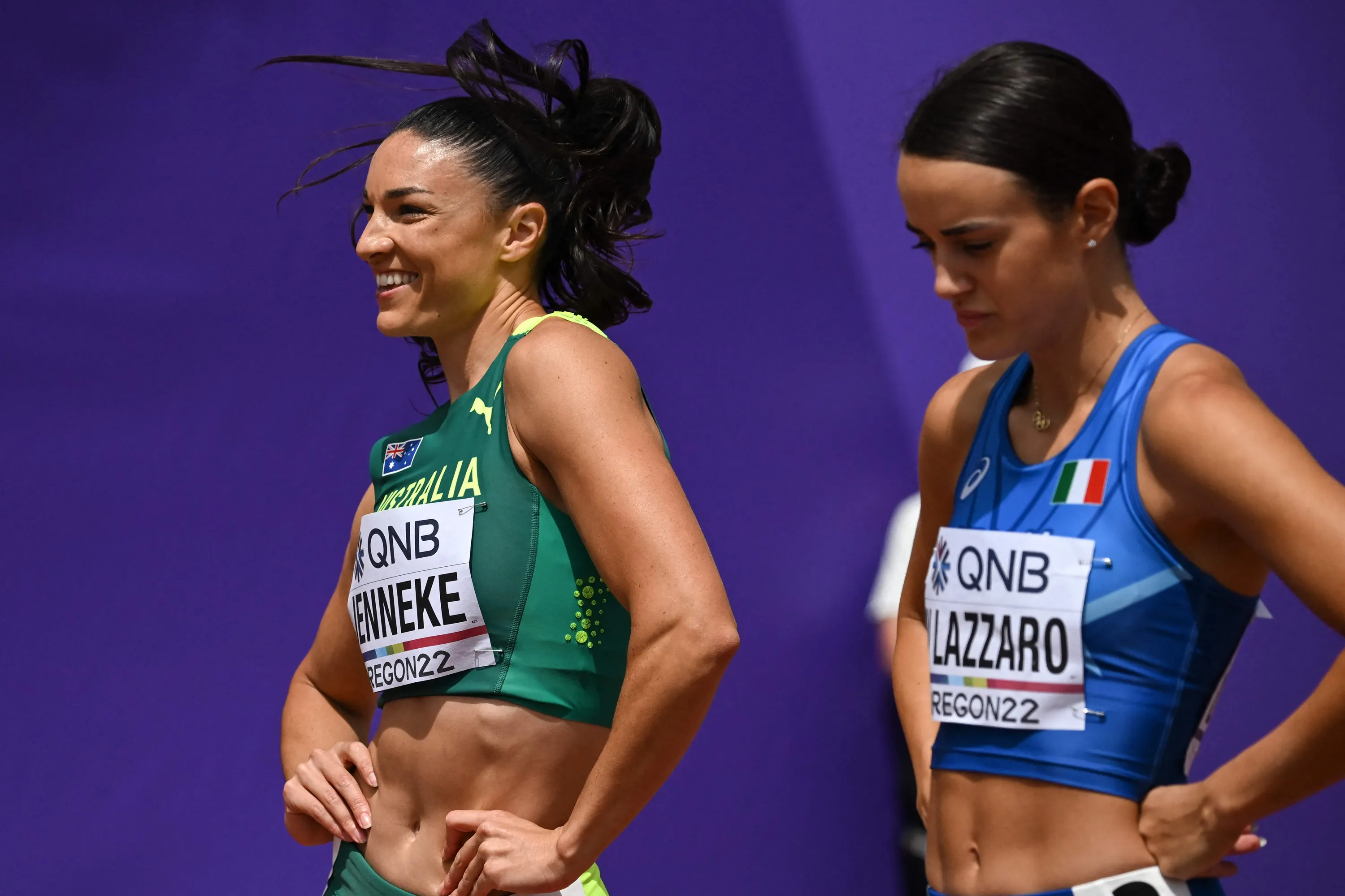 Australia's Michelle Jenneke (L) and Italy's Elisa Maria Di Lazzaro prepare to compete in the women's 100m hurdles heats during the World Athletics Championships at Hayward Field in Eugene, Oregon on July 23, 2022. (Photo by Ben Stansall/AFP Photo)
