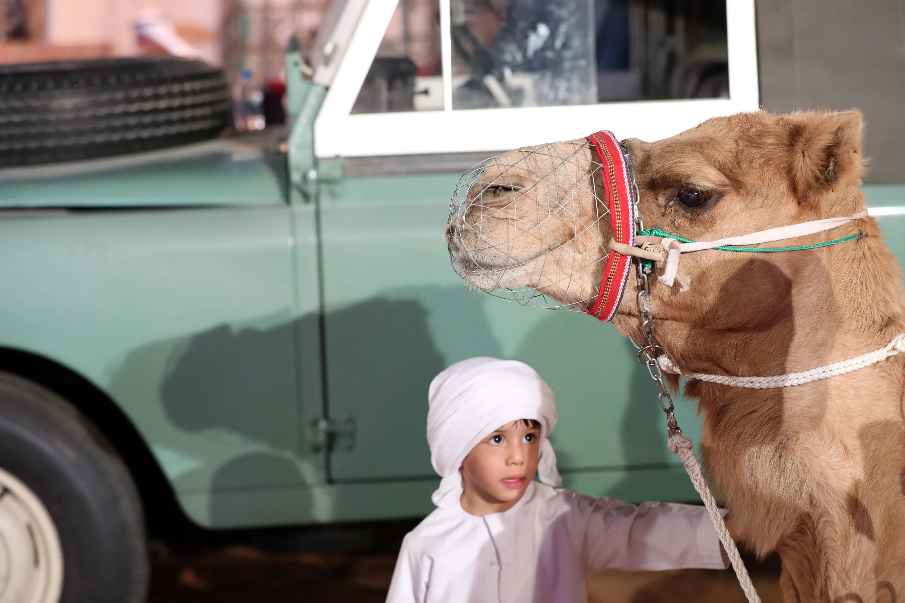 Marzog aged 3 strokes a camel on the opening day of the Sheikh Zayed Festival in Al Wathba, Abu Dhabi on November 18, 2022. (Photo by Chris Whiteoak/The National)