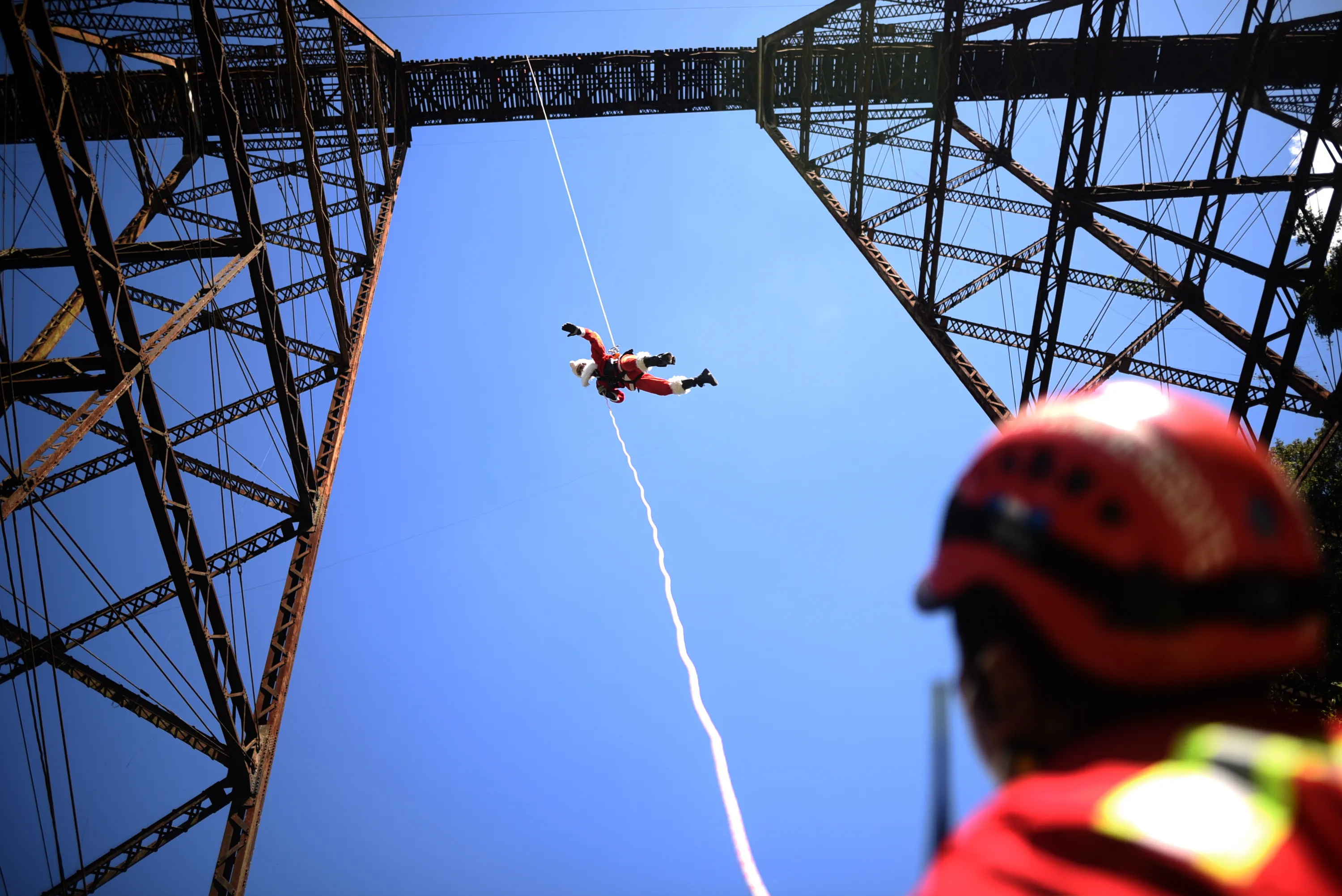 The Senior Officer of the Municipal Firefighters, Hector Chacon, dressed as Santa Claus, rappels down from a bridge, in Guatemala City, Guatemala, 17 December 2022. With joy and smiles, hundreds of children from three marginalized settlements in the northeast of Guatemala City received a visit on 17 December from a Santa Claus who comes down from a bridge every year and does not forget his gifts. This is the 76-year-old firefighter Hector Chacon, who started the tradition in 1997 and on 17 December again went down a bridge with the technique of rappelling to share gifts with children who live under scarce resources. (Photo by Edwin Bercian/EPA/EFE)