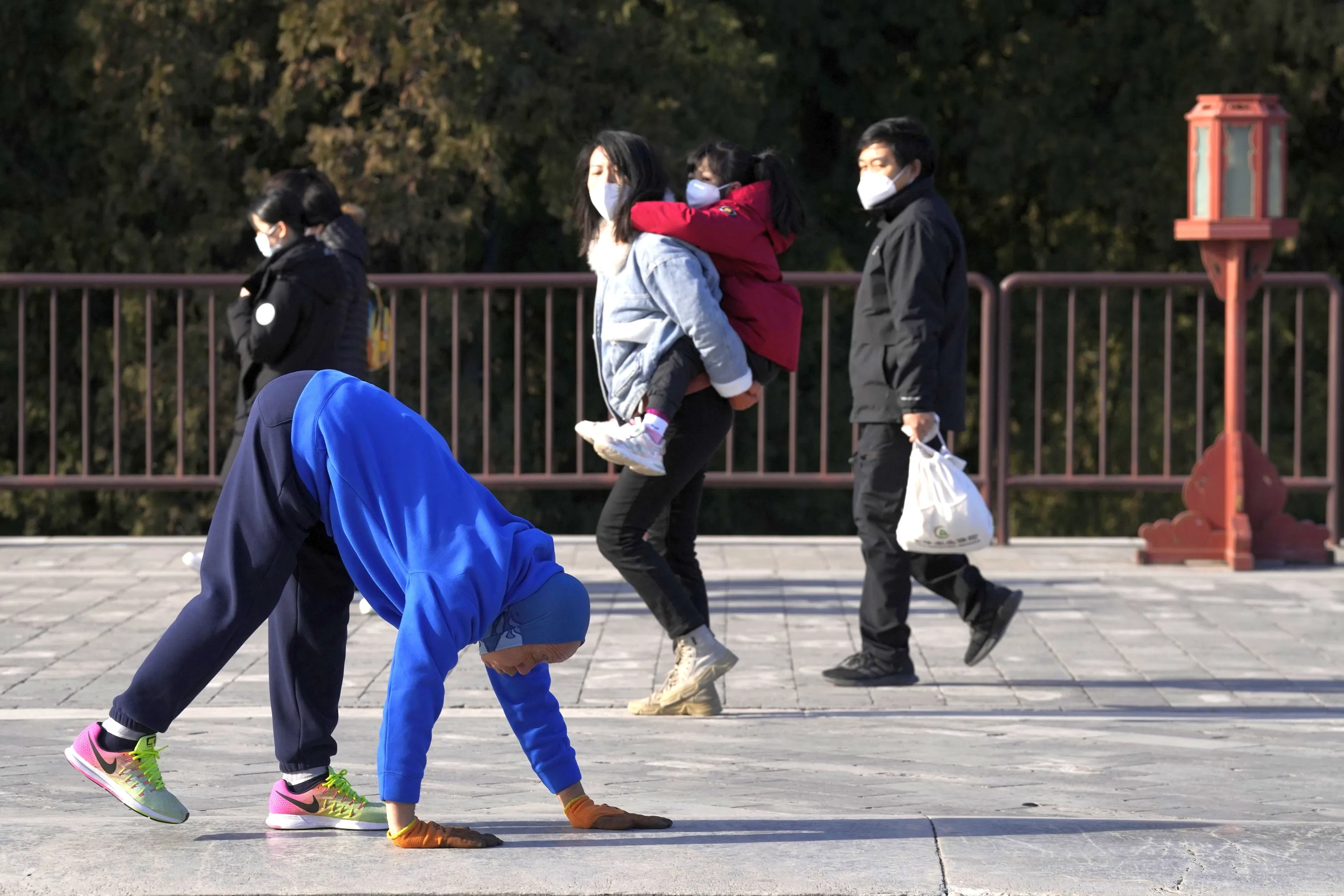 Visitors wearing masks watch as a resident walks on all four limbs as a form of exercise in the Temple of Heaven park in Beijing, Thursday, December 8, 2022. In a move that caught many by surprise, China announced a potentially major easing of its rigid “zero-COVID” restrictions, without formally abandoning the policy altogether. (Photo by Ng Han Guan/AP Photo)