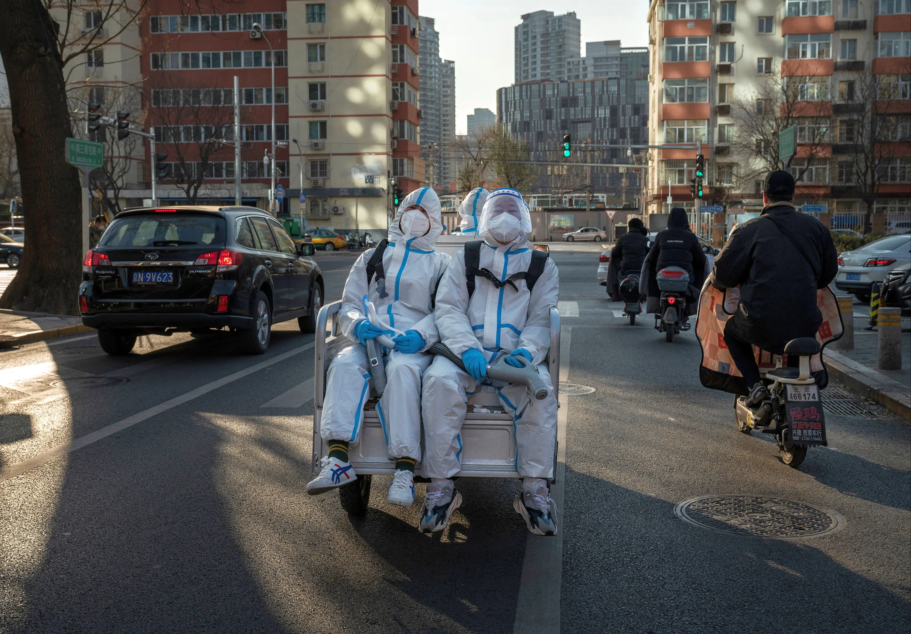 Epidemic control workers wear PPE as they ride on the back of a three wheeler on their way to disinfect an epidemic area on December 9, 2022 in Beijing, China. As part of a 10 point directive, Chinas government announced Wednesday that people with COVID-19 who have mild or no symptoms will be permitted to quarantine at home instead of at a government facility, testings requirements are reduced, people are permitted to buy over the counter medications, and local officials can no longer lock down entire neighbourhoods or cities, a major shift in its zero COVID policy. (Photo by Kevin Frayer/Getty Images)