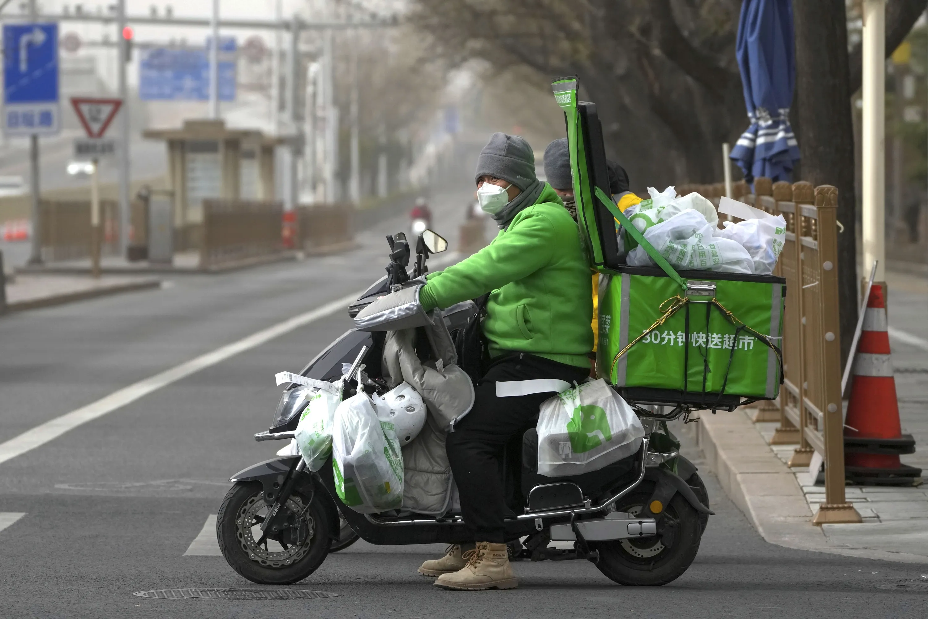 A delivery worker rides on his bike loaded with customers' online order groceries on a street in Beijing, Monday, December 12, 2022. China will drop a travel tracing requirement as part of an uncertain exit from its strict “zero-COVID” policies that have elicited widespread dissatisfaction. (Photo by Andy Wong/AP Photo)