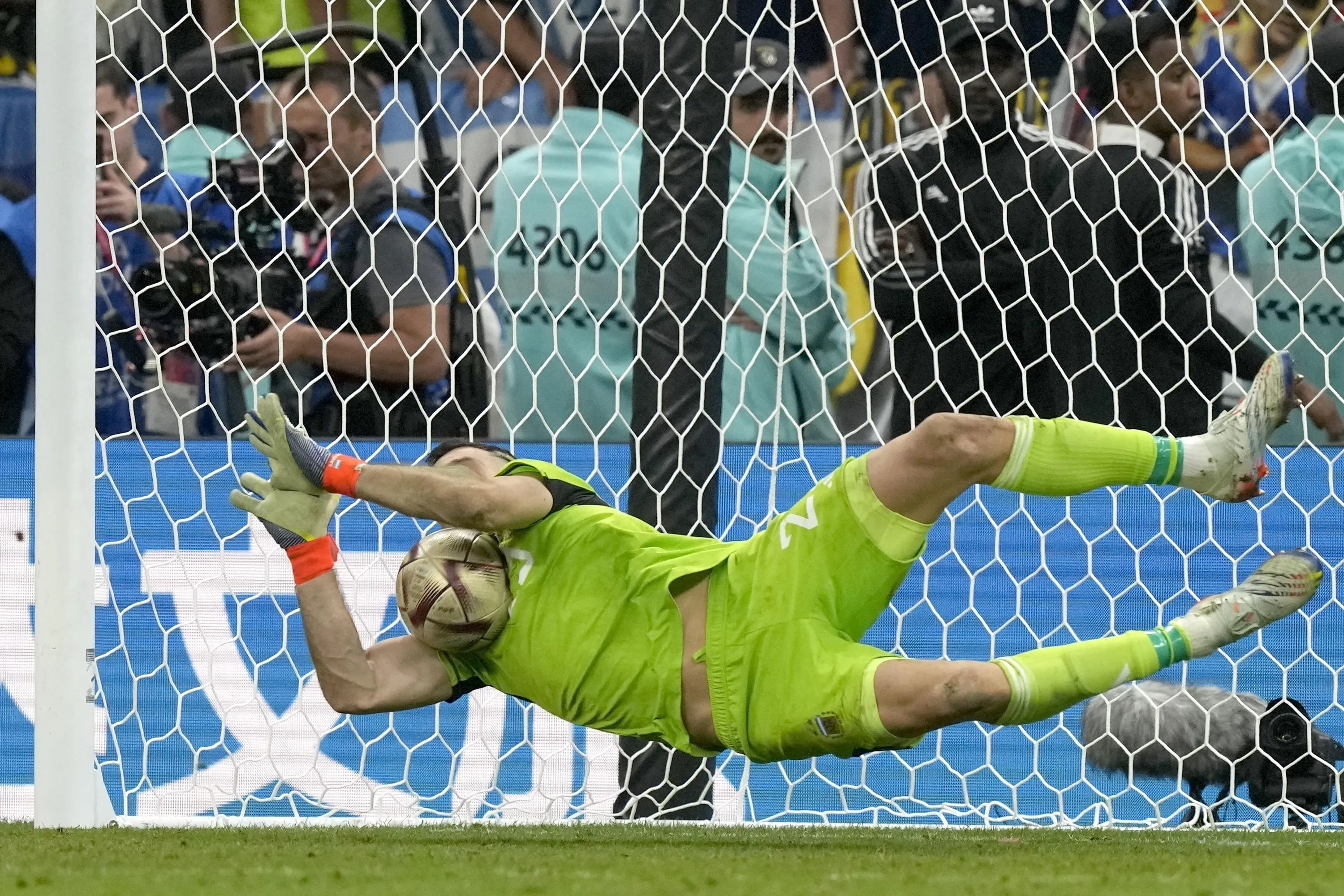 Argentina's goalkeeper Emiliano Martinez saves a penalty shot during the World Cup final soccer match between Argentina and France at the Lusail Stadium in Lusail, Qatar, Sunday, December 18, 2022. (Photo by Frank Augstein/AP Photo)