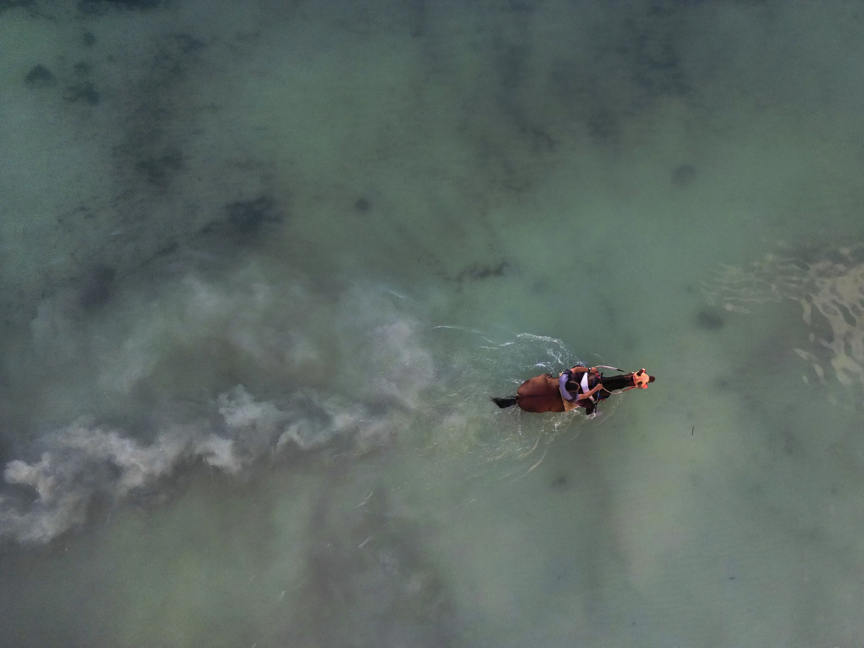 Horse trainer Jose Guerrero rides one of his thoroughbred horses in the shallow part of the sea on San Andres Island in Colombia, Wednesday, November 9, 2022. Horse races used to be held on the beach but the spread of hotels and tourists made that impractical, so they've been moved to a forest trail. (Photo by Ivan Valencia/AP Photo)