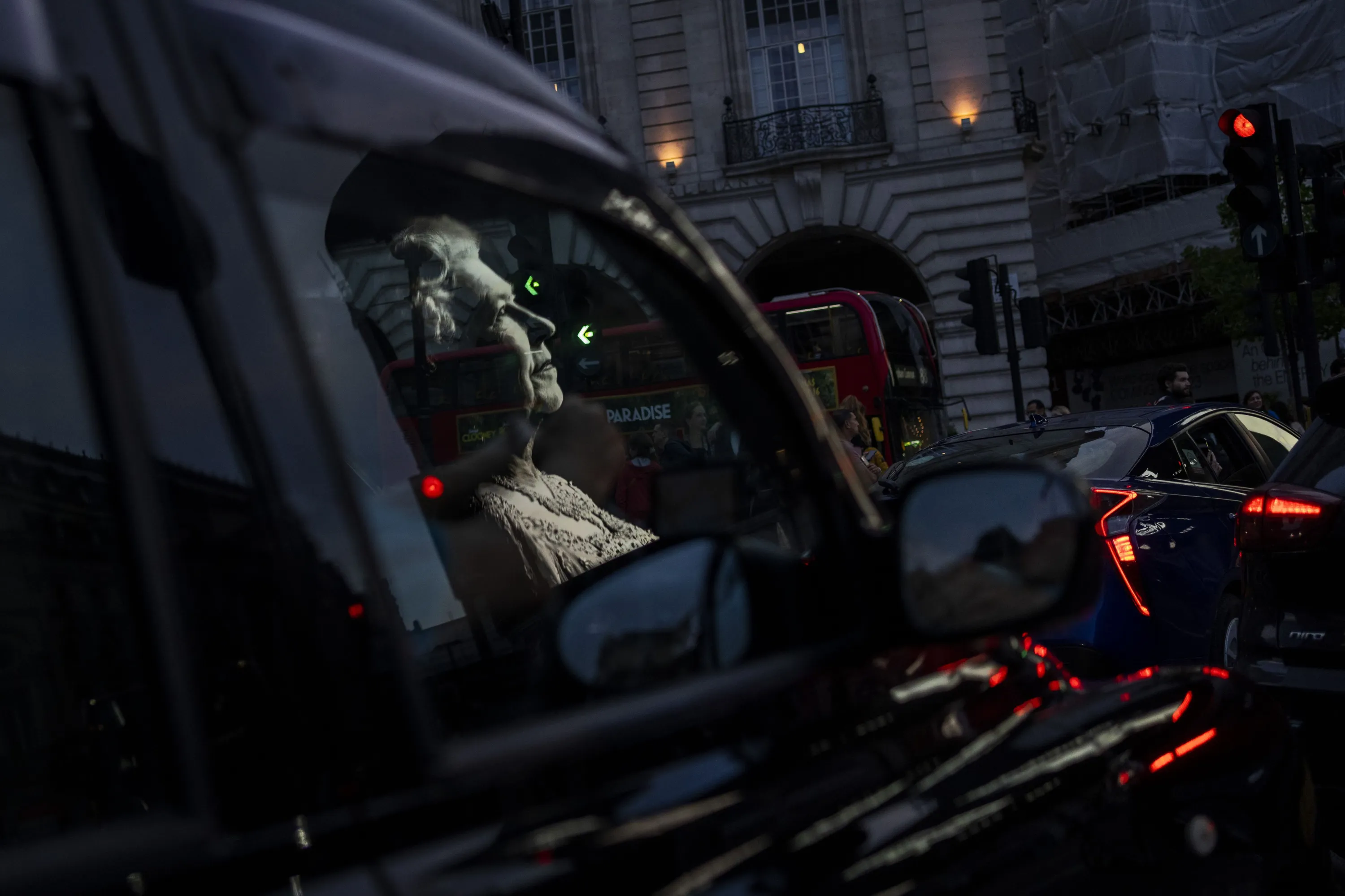 A tribute to the Queen is reflected on a taxi at Piccadilly Circus in London, Friday, September 9, 2022. (Photo by Bernat Armangue/AP Photo)