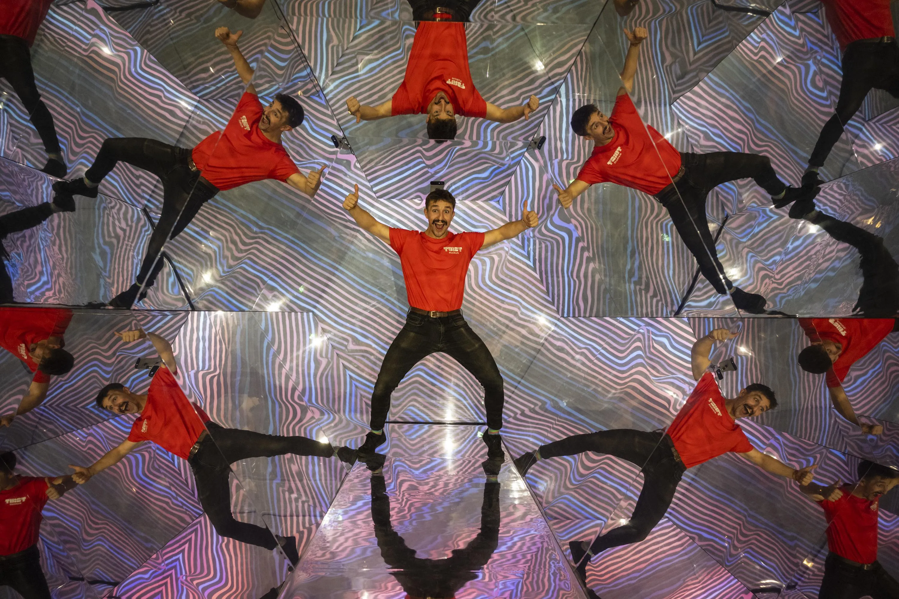 A staff member has fun inside a room-sized digital kaleidoscope by Aristotle Rounfanis at the new Twist (The Way I See Things) Museum, in a former Zara store on Oxford Street, London on November 14, 2022. (Photo by Stephen Chung/London News Pictures)