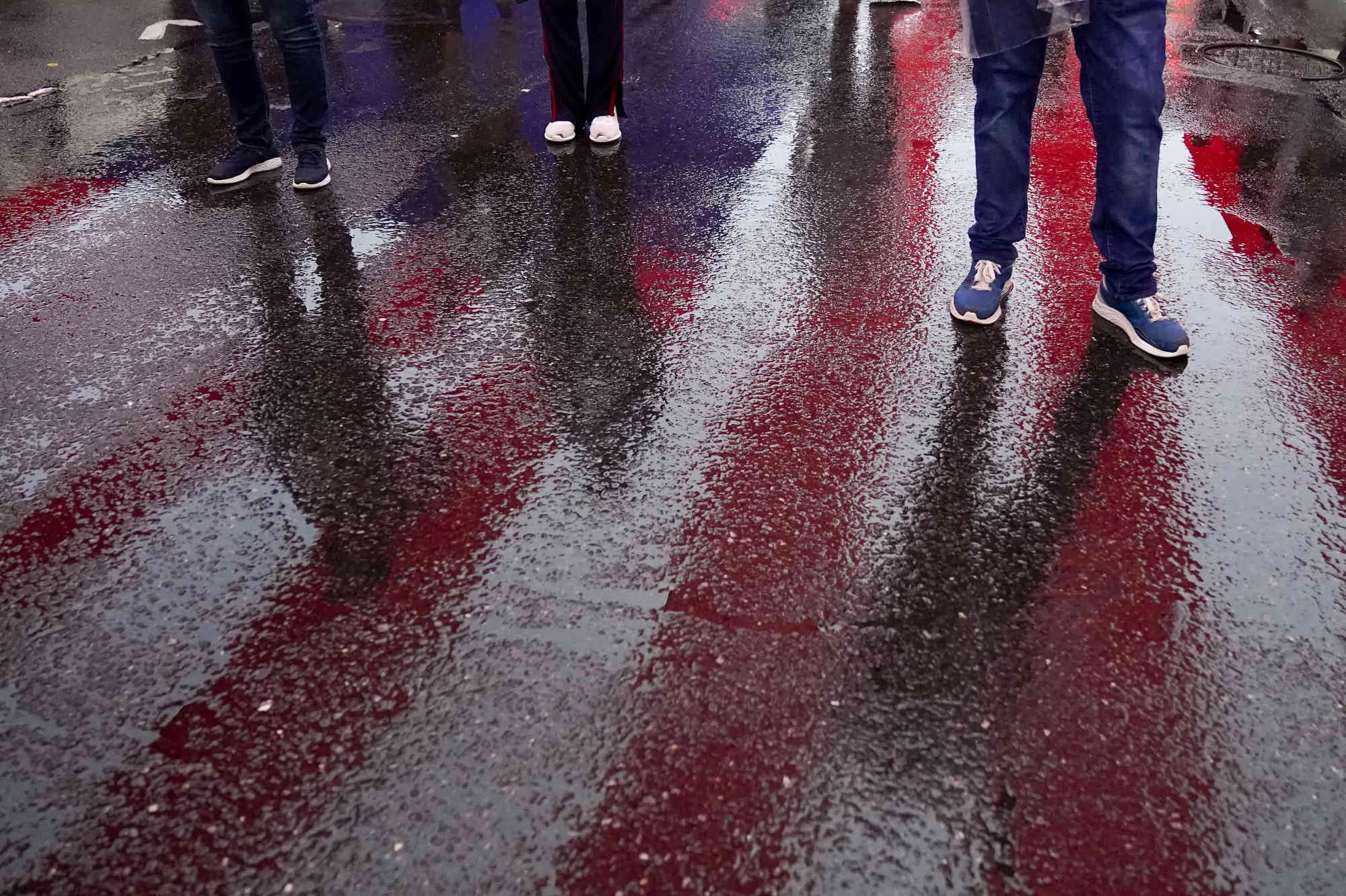 A large American flag is seen reflected in the wet asphalt as members of the Wounded Warrior Project march up Fifth Avenue during the Veterans Day Parade, Friday, November 11, 2022, in New York. (Photo by Mary Altaffer/AP Photo)