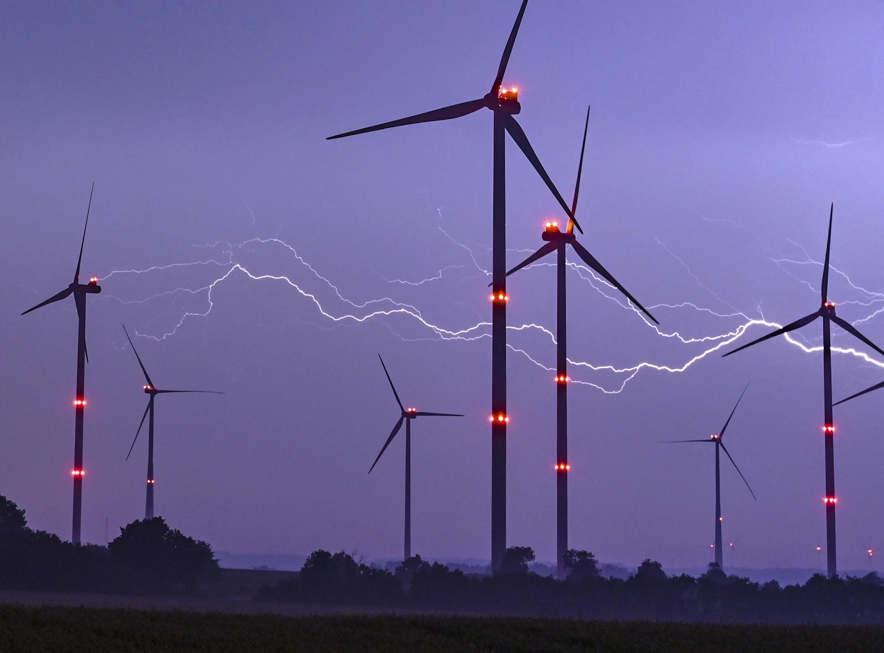 A flash lights up the night sky above wind turbines with red position lights in Jacobsdorf, Germany, Friday, May 20, 2022. (Photo by Patrick Pleul/dpa via AP Photo)