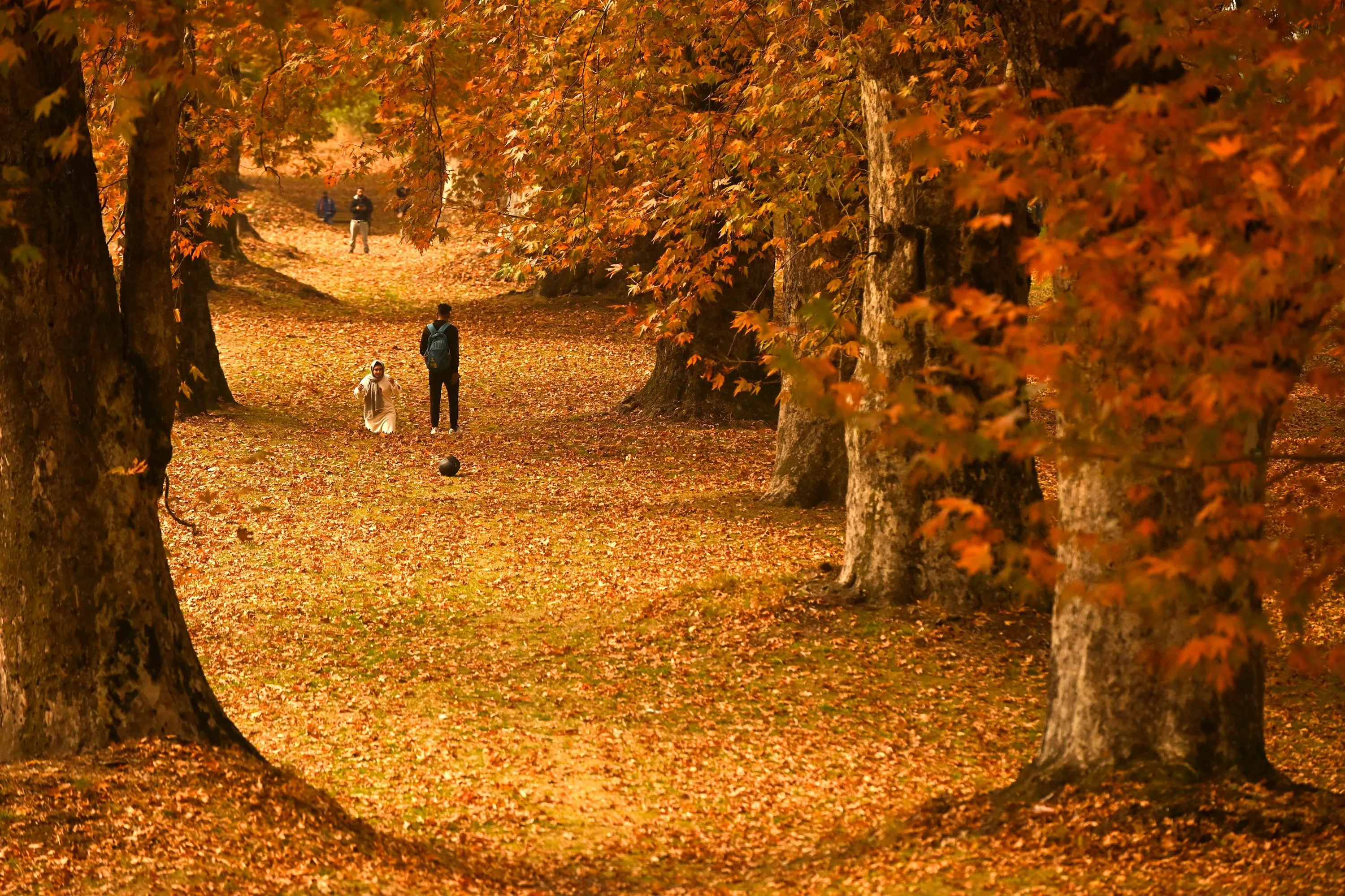 People walk amid maple trees at Nishat Garden in Srinagar on November 1, 2022. (Photo by Tauseef Mustafa/AFP Photo)