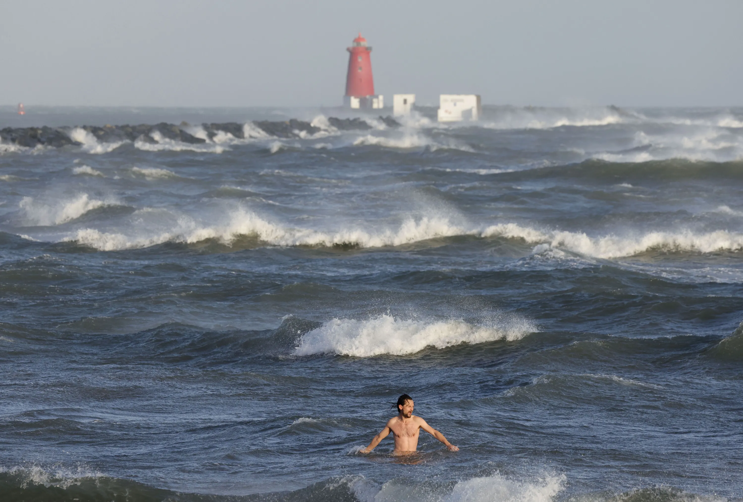 Jason McNamara from Ringsend enjoys a swim as a rising tide against an off shore wind creates white crested waves near the Great Wall and Poolbeg lighthouse in Dublin on November 2, 2022. (Photo by Alan Betson/The Irish Times)