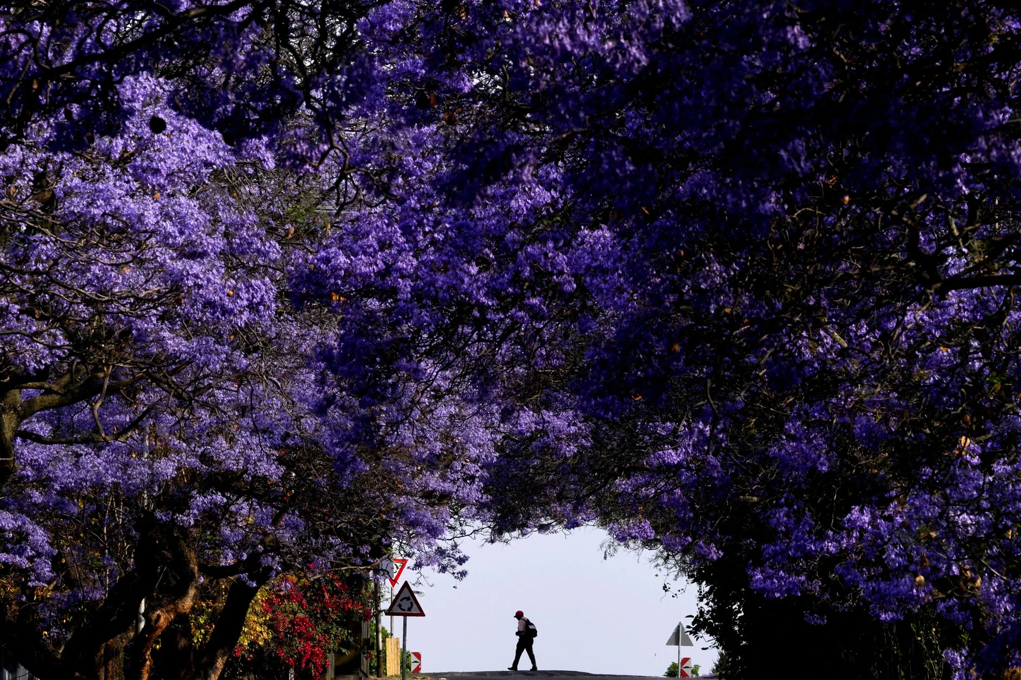 A person walks under blooming jacaranda trees in a suburban street in Pretoria, South Africa, Wednesday, October 12, 2022. Some 70,000 jacarandas line the streets of the northern suburbs signalling the approaching summer months in the southern hemisphere. (Photo by Themba Hadebe/AP Photo)