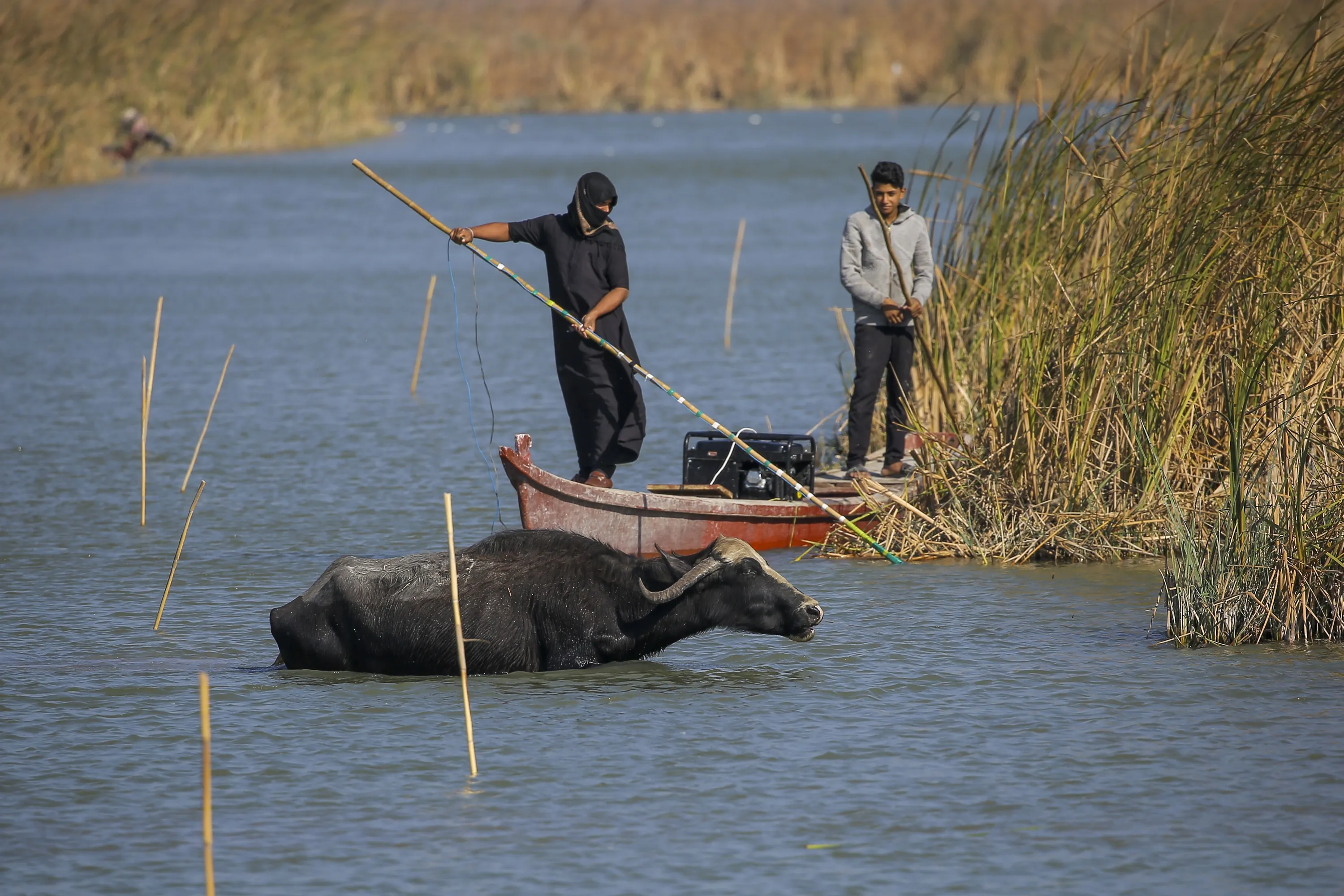 Iraqi buffalo herders in the marshes of Chibayish collect reeds as water buffalos drink water following a summer of severe water shortages in Dhi Qar province, Iraq, Sunday, November 20, 2022.. (Photo by Anmar Khalil/AP Photo)