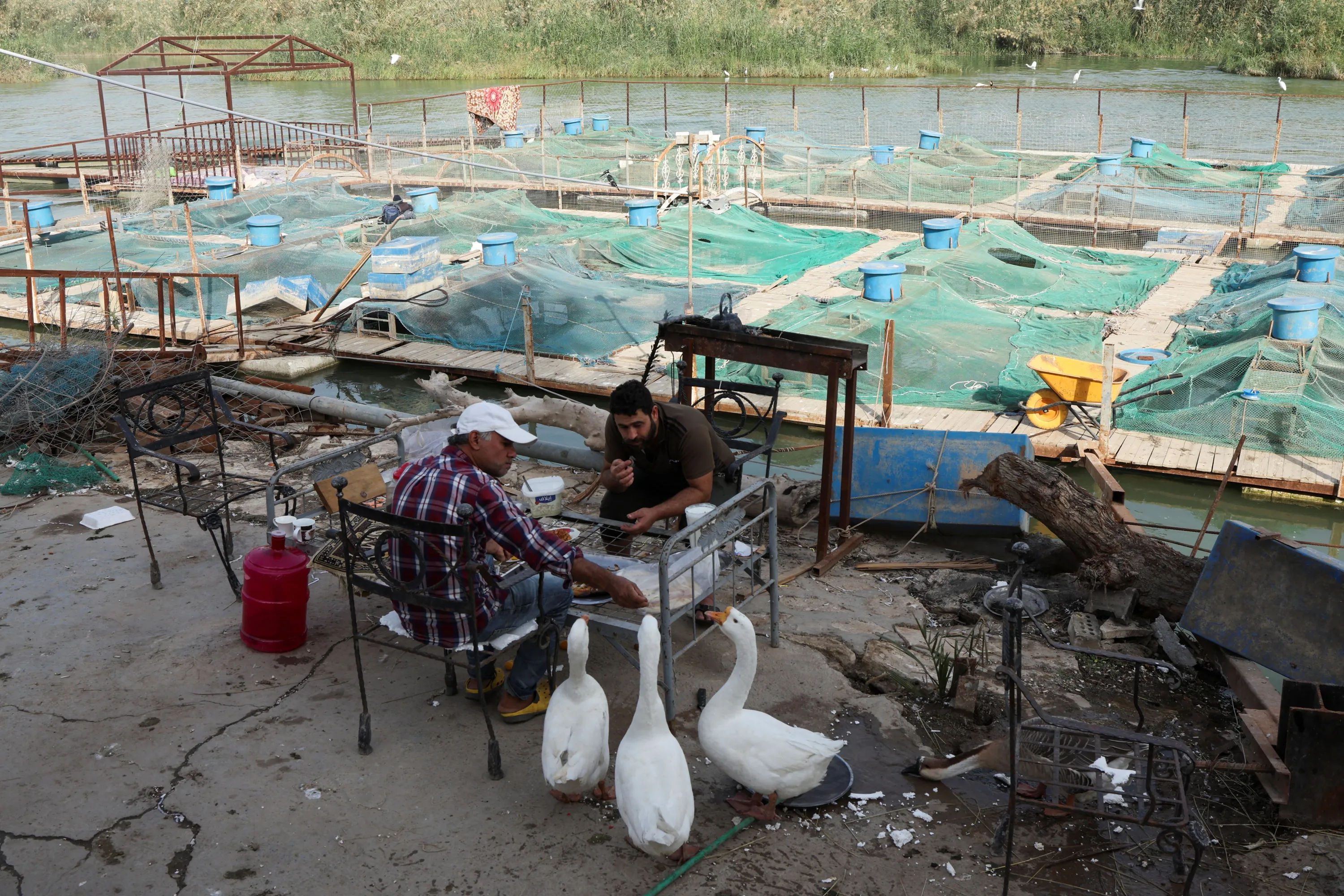 Workers feed ducks during their rest near fish farming pond at the Euphrates River in Najaf, Iraq on November 30, 2022. (Photo by Alaa Al-Marjani/Reuters)