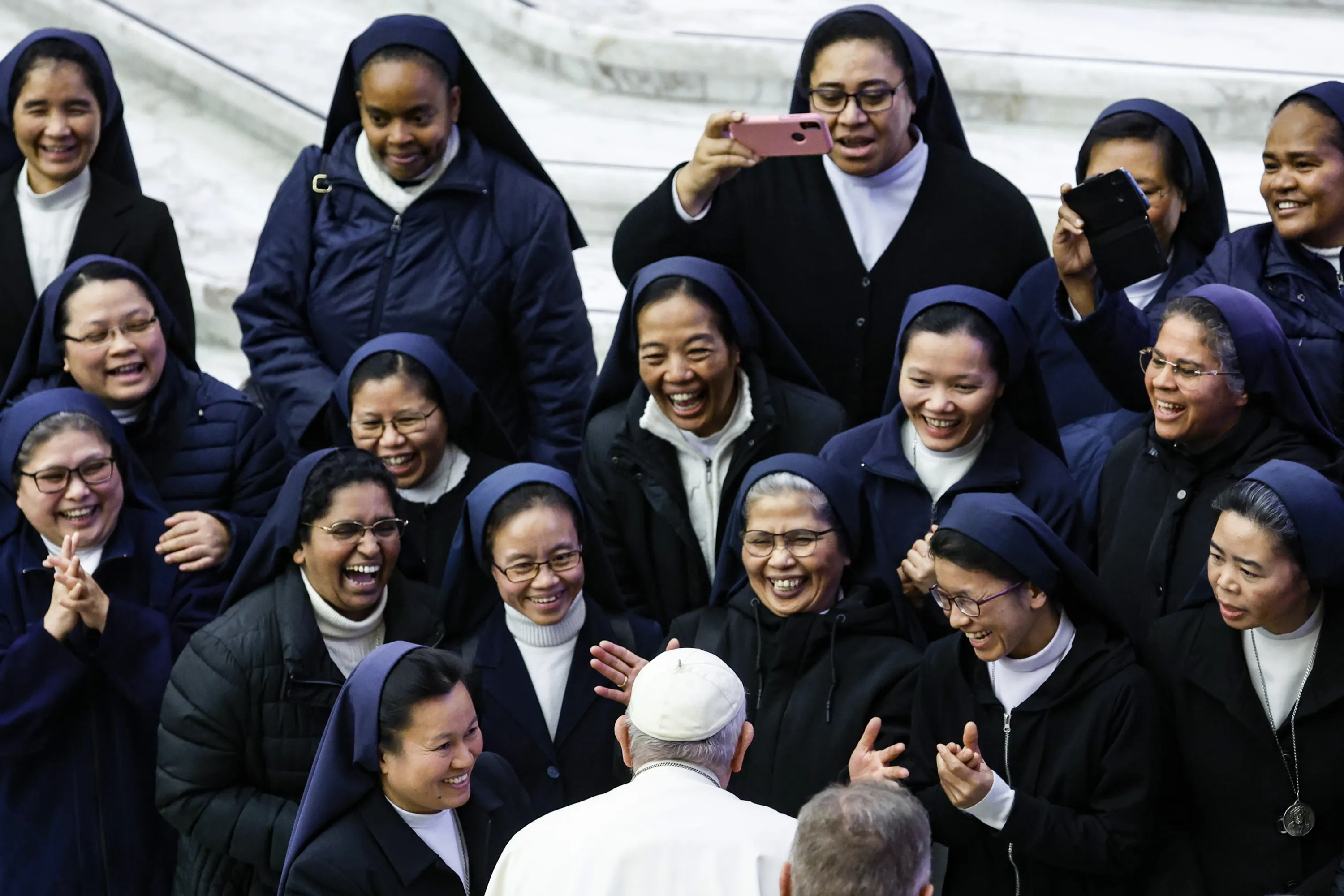 Pope Francis talks with nuns during the weekly General Audience in the Paul VI Audience Hall, in Vatican City, 21 December 2022. (Photo by Fabio Frustaci/EPA/EFE)