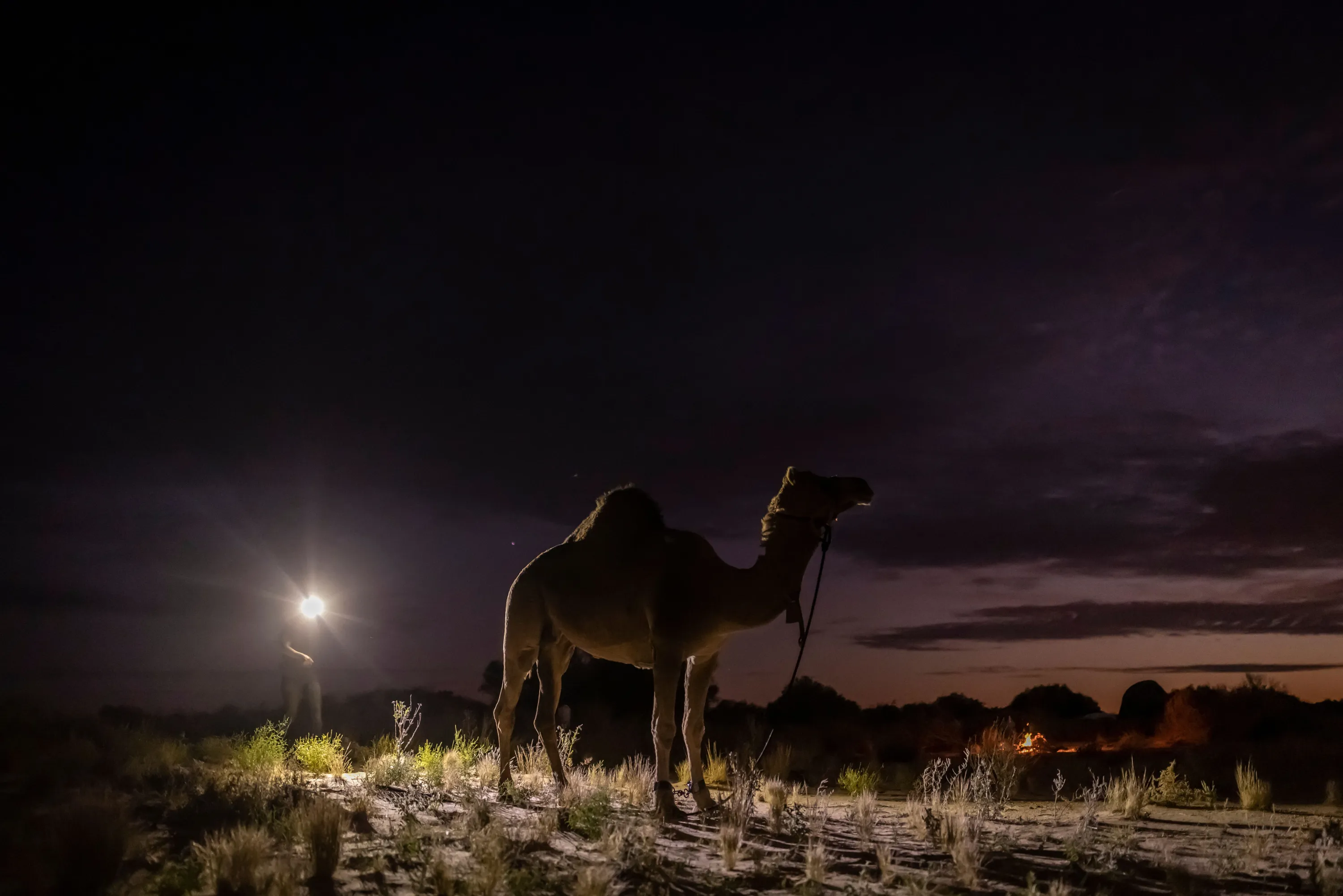 One Sophie Matterson's Camels is lit by her head torch as camp is made for the night on May 21, 2021 near Oodnadatta, Australia. Sophie Matterson, 32, is on a 5,000km journey – walking with five camels coast to coast from Australia's western-most point in Shark Bay, Western Australia, to its eastern-most point in Byron Bay, New South Wales. (Photo by Brook Mitchell/Getty Images)
