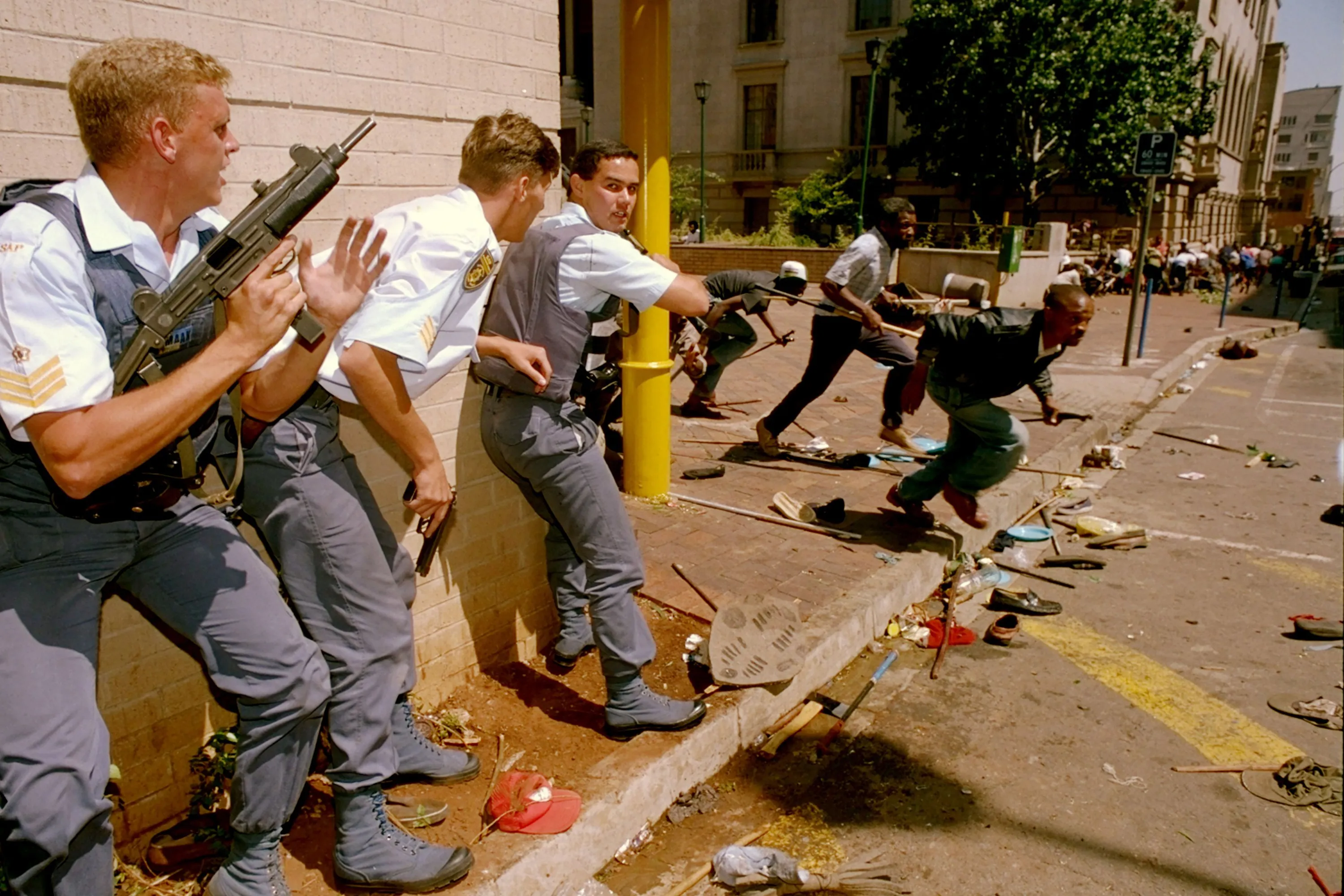 Police take cover as Zulu Inkatha Freedom Party (IFP) supporters flee as they are fired upon by unidentified gunmen, March 28, 1994, in Johannesburg. South Africa is engrossed in debate over the legacy of apartheid's last president, F.W. de Klerk, who died at 85 and is to be buried Sunday, Nov 21, 2021. Some people want to remember de Klerk as the liberator of Nelson Mandela, but others say he was responsible for racist murders. (Photo by Peter Dejong/AP Photo/File)