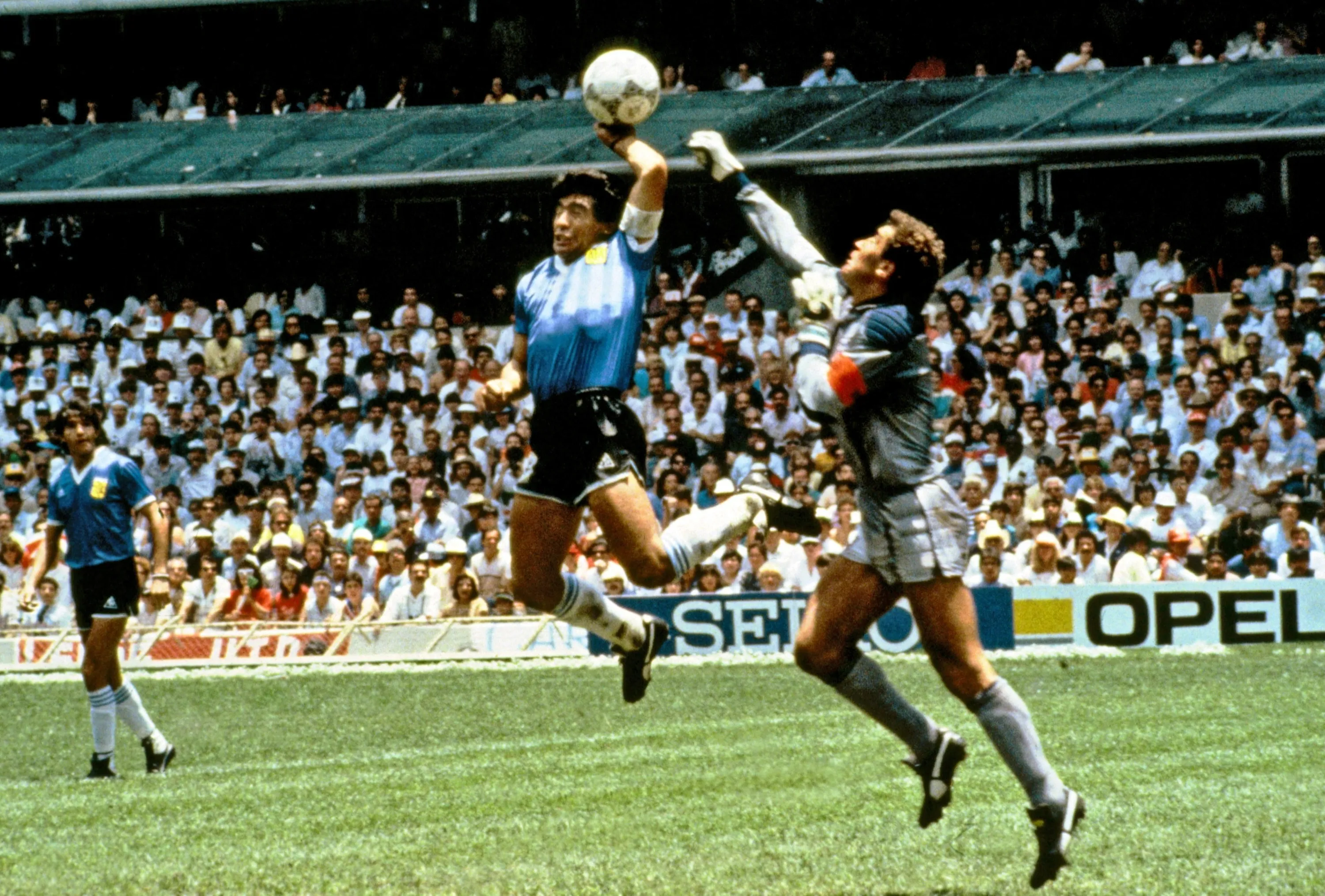 Argentina's Diego Maradona scores 1st goal with his Hand of God, past England goalkeeper Peter Shilton during Football World Cup Quarter Final in Mexico on 22nd June, 1986. (Photo by Bob Thomas Sports Photography via Getty Images)