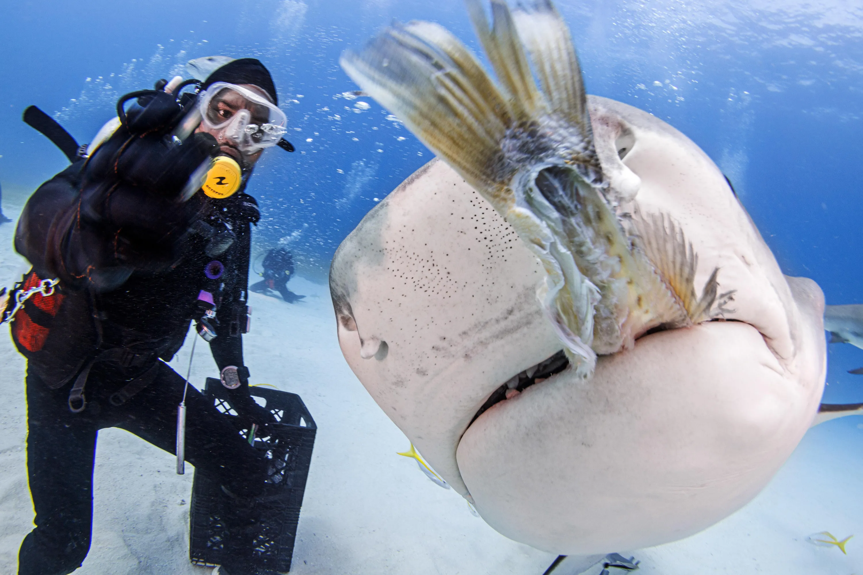 David Martinez, a divemaster and shark feeder, risks life and limb when he hand feeds tiger sharks at Tiger Beach in the Bahamas in December 2022. (Photo by Caters News Agency)