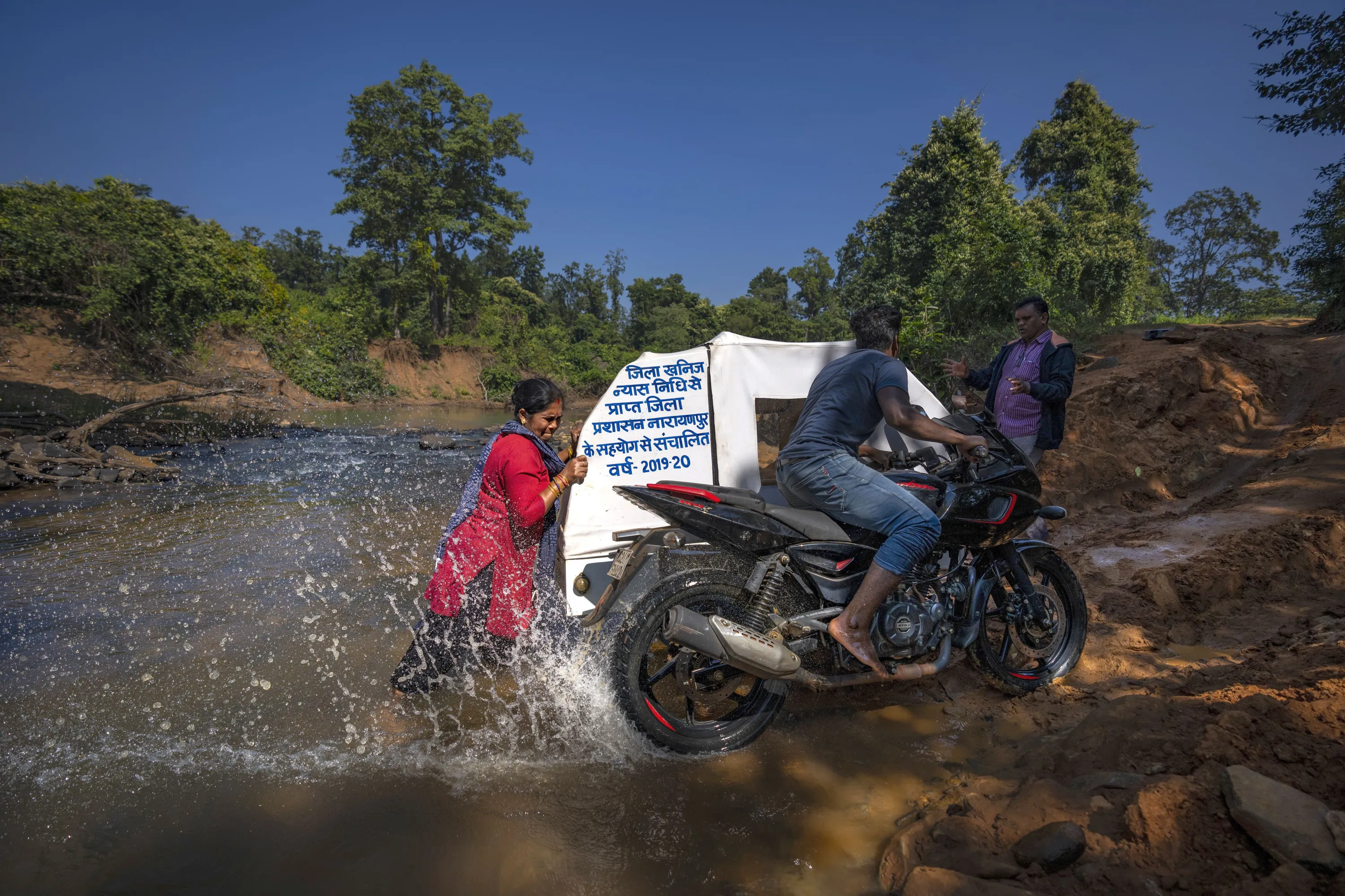 Lata Netam, a health worker, unsuccessfully tries to push a motorbike ambulance, up a steep riverbank through Abhujmarh, or “the unknown hills”, to reach a pregnant woman in Kodoli, a remote village near Orchha in central India's Chhattisgarh state, November 15, 2022. These ambulances, first deployed in 2014, reach inaccessible villages to bring pregnant women to an early referral center, a building close to the hospital where expectant mothers can stay under observation, routinely visit doctors if needed until they give birth. Since then the number of babies born in hospitals has doubled to a yearly average of about 162 births each year, from just 76 in 2014. The state has one of the highest rates of pregnancy-related deaths for mothers in India, about 1.5 times the national average, with 137 pregnancy related deaths for mothers per 100,000 births. (Photo by Altaf Qadri/AP Photo)
