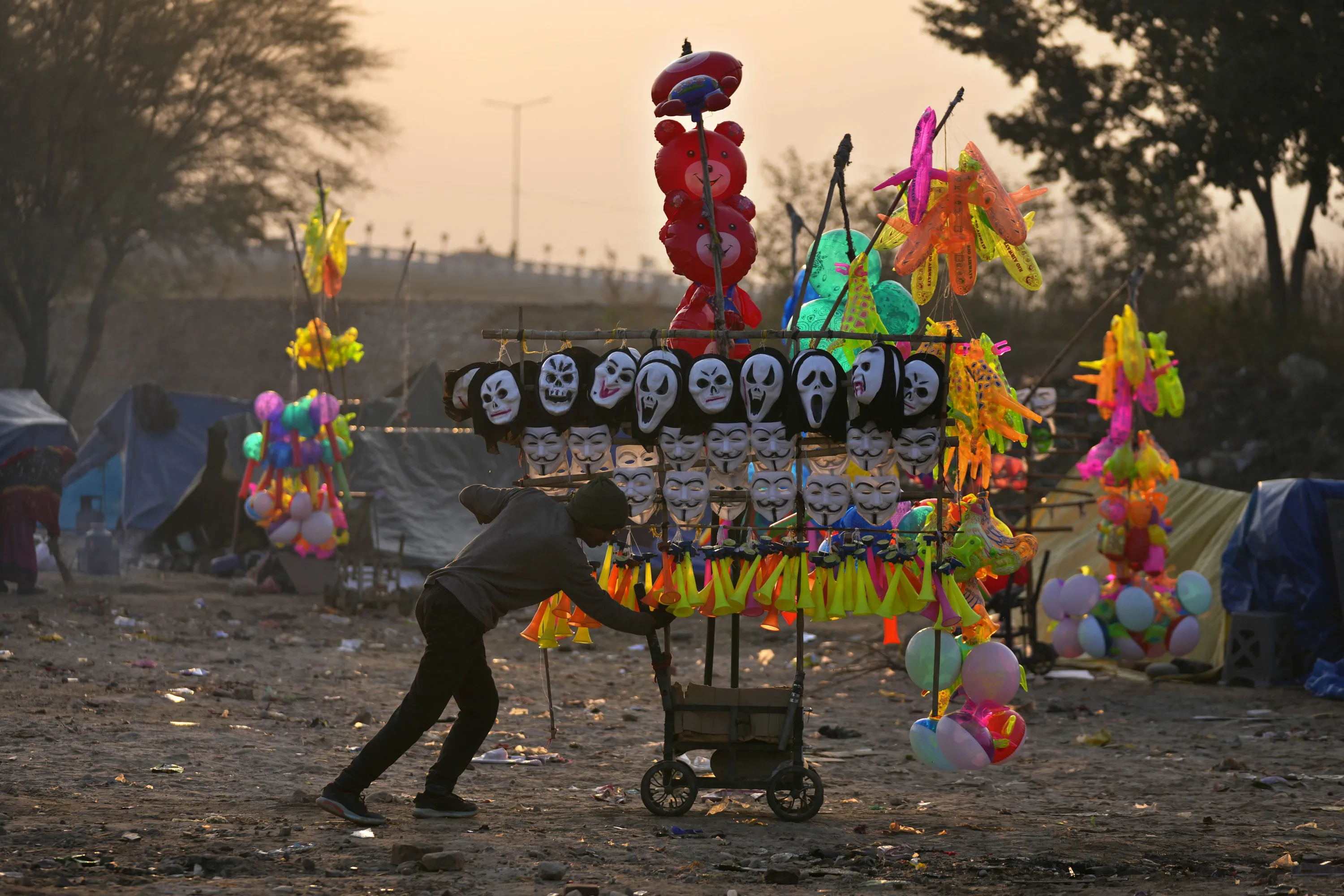 A migrant street vendor pushes his cart to work as he starts his day from his temporary shelter on a cold morning in Jammu, India, Wednesday, December 21, 2022. (Photo by Channi Anand/AP Photo)