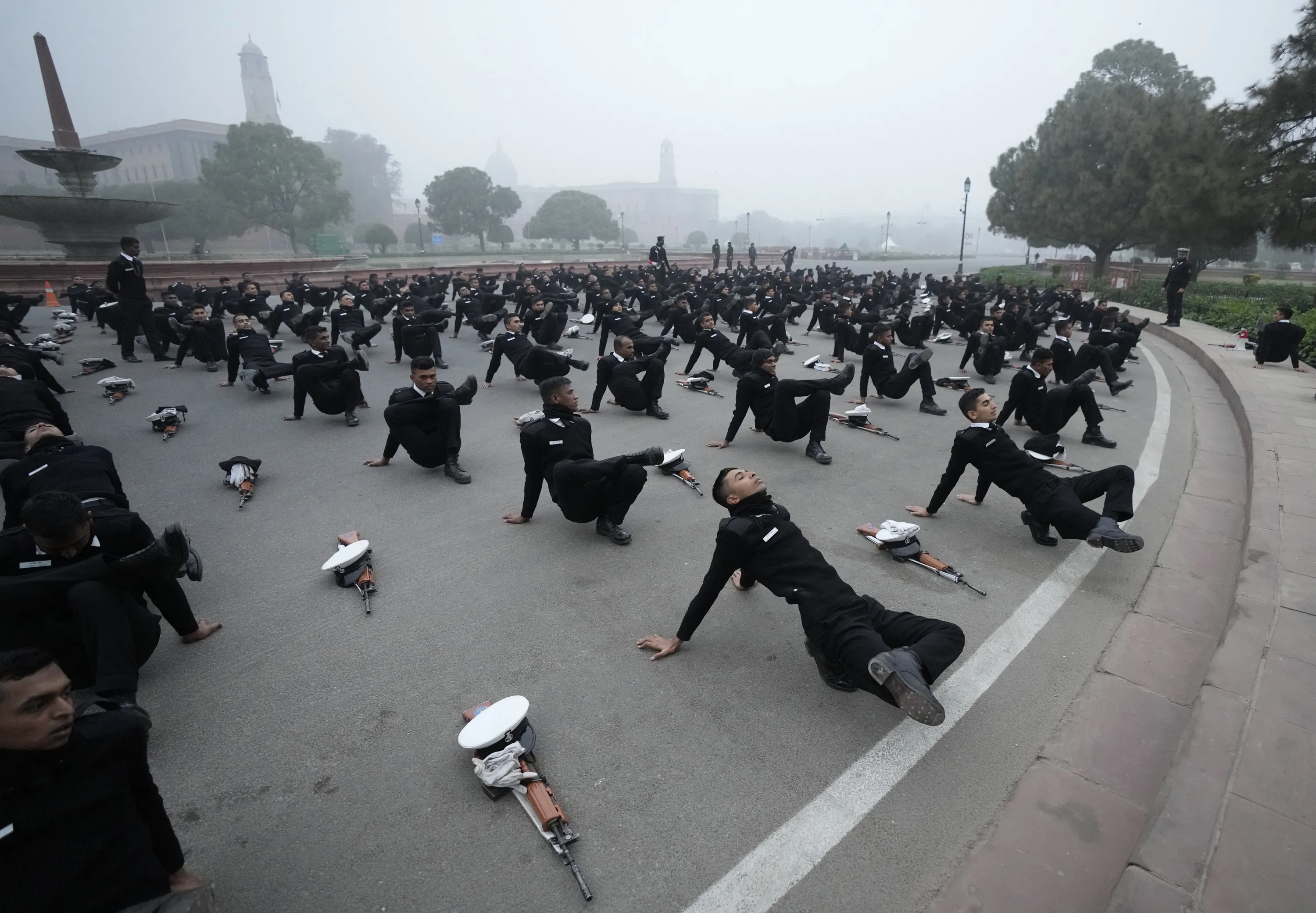 Indian naval soldiers rehearse to prepare for the upcoming Republic day parade amidst morning smog in New Delhi, India, Thursday, December 22, 2022. (Photo by Manish Swarup/AP Photo)