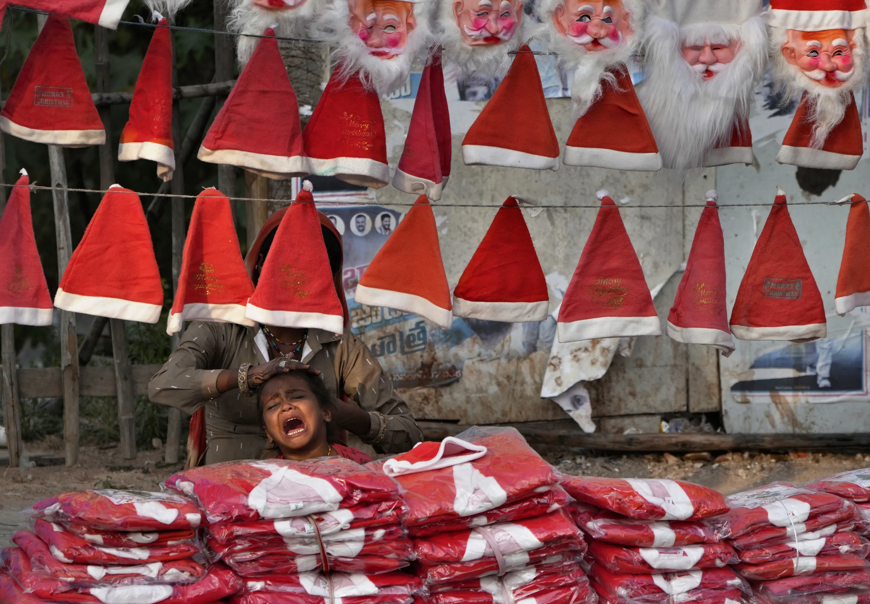 A street vendor selling Santa caps combs her daughter as she waits for buyers ahead of Christmas in Hyderabad, India, Thursday, December 22, 2022. (Photo by Mahesh Kumar A./AP Photo)