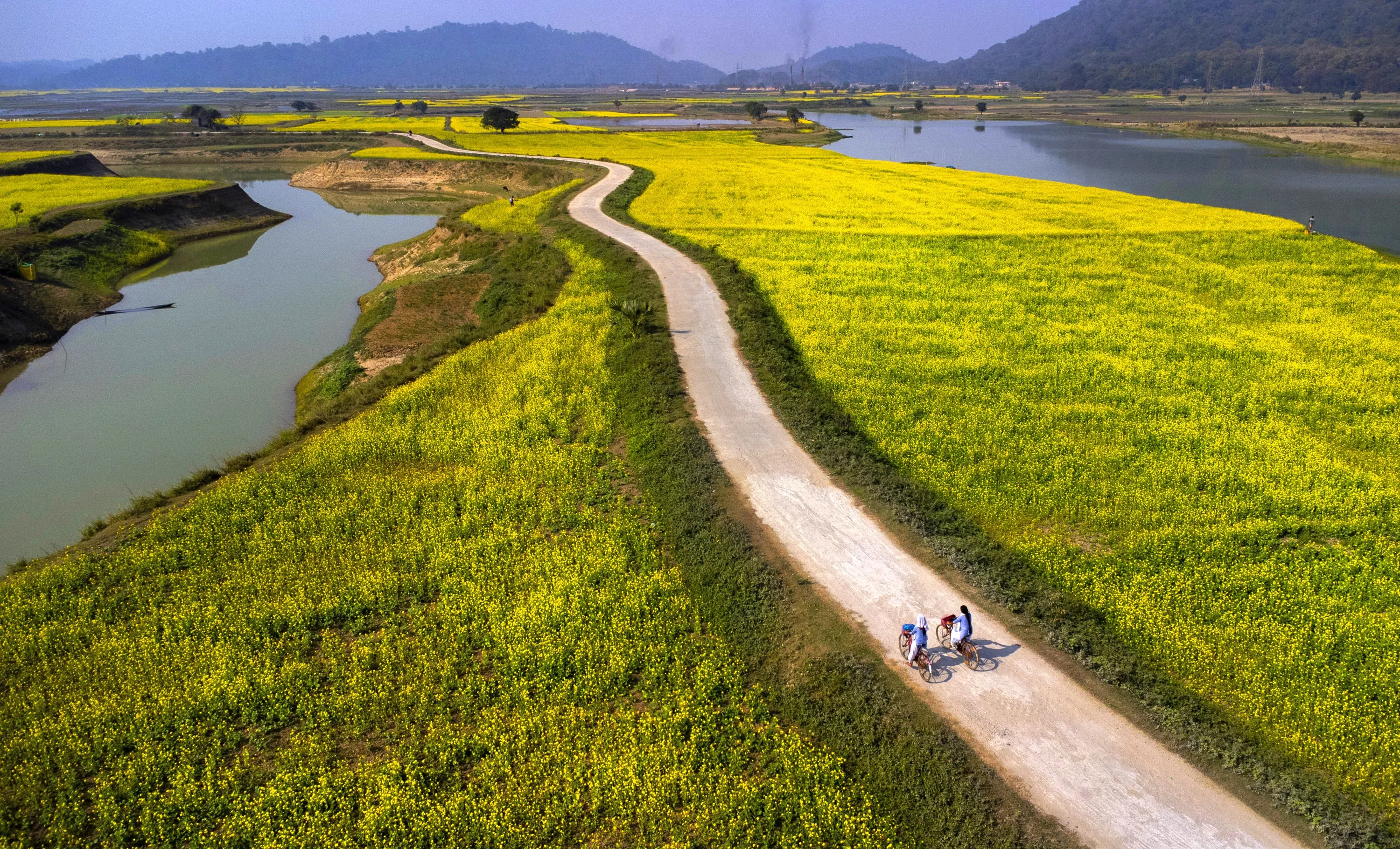 College students ride on their bicycles through the mustard fields on the outskirts of Guwahati, India, Thursday, December 22, 2022. (Photo by Anupam Nath/AP Photo)