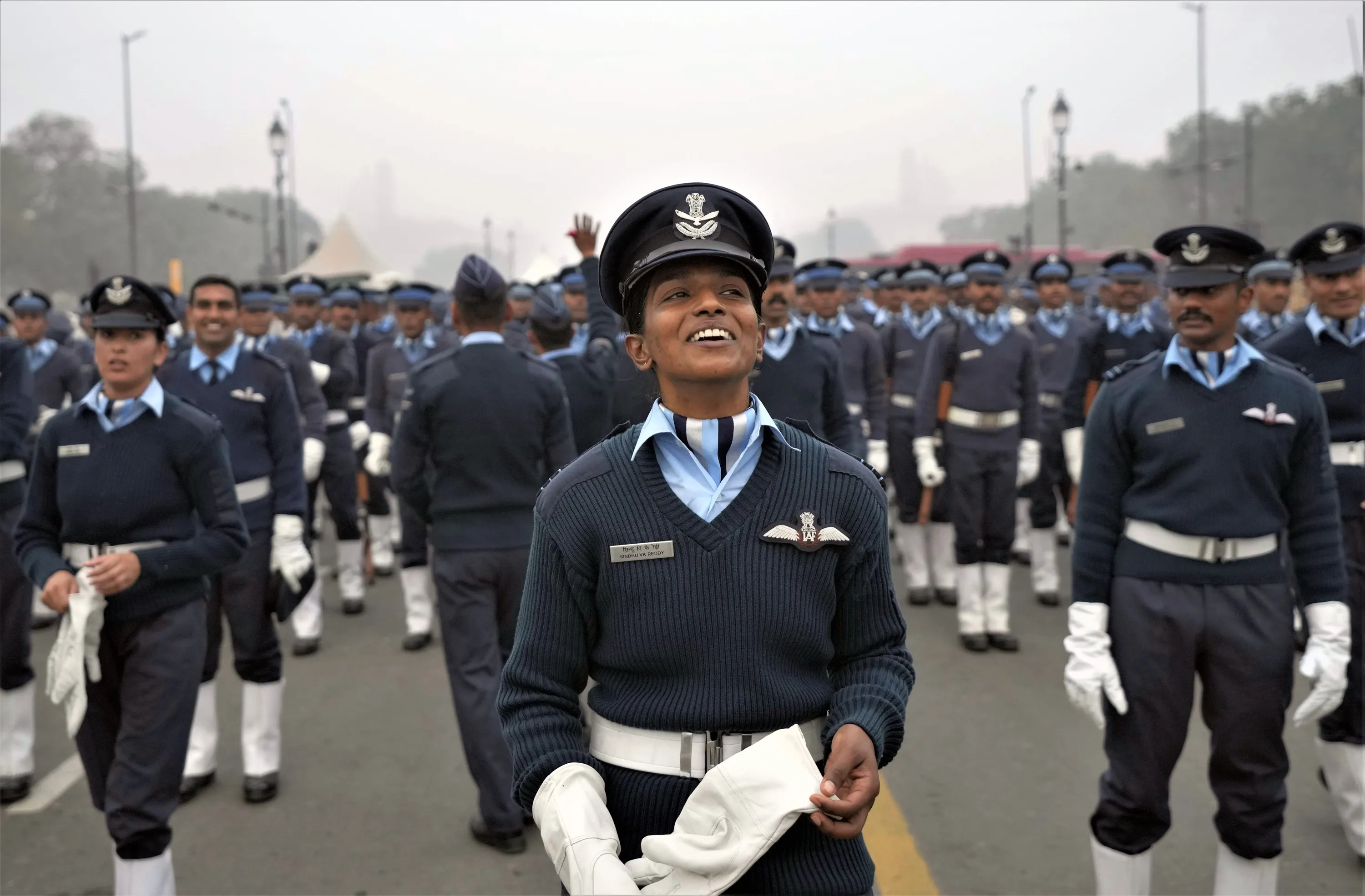 An Indian Air Force officer reacts as they rehearse to prepare for the upcoming Republic day parade amidst morning smog in New Delhi, India, Thursday, December 22, 2022. (Photo by Manish Swarup/AP Photo)