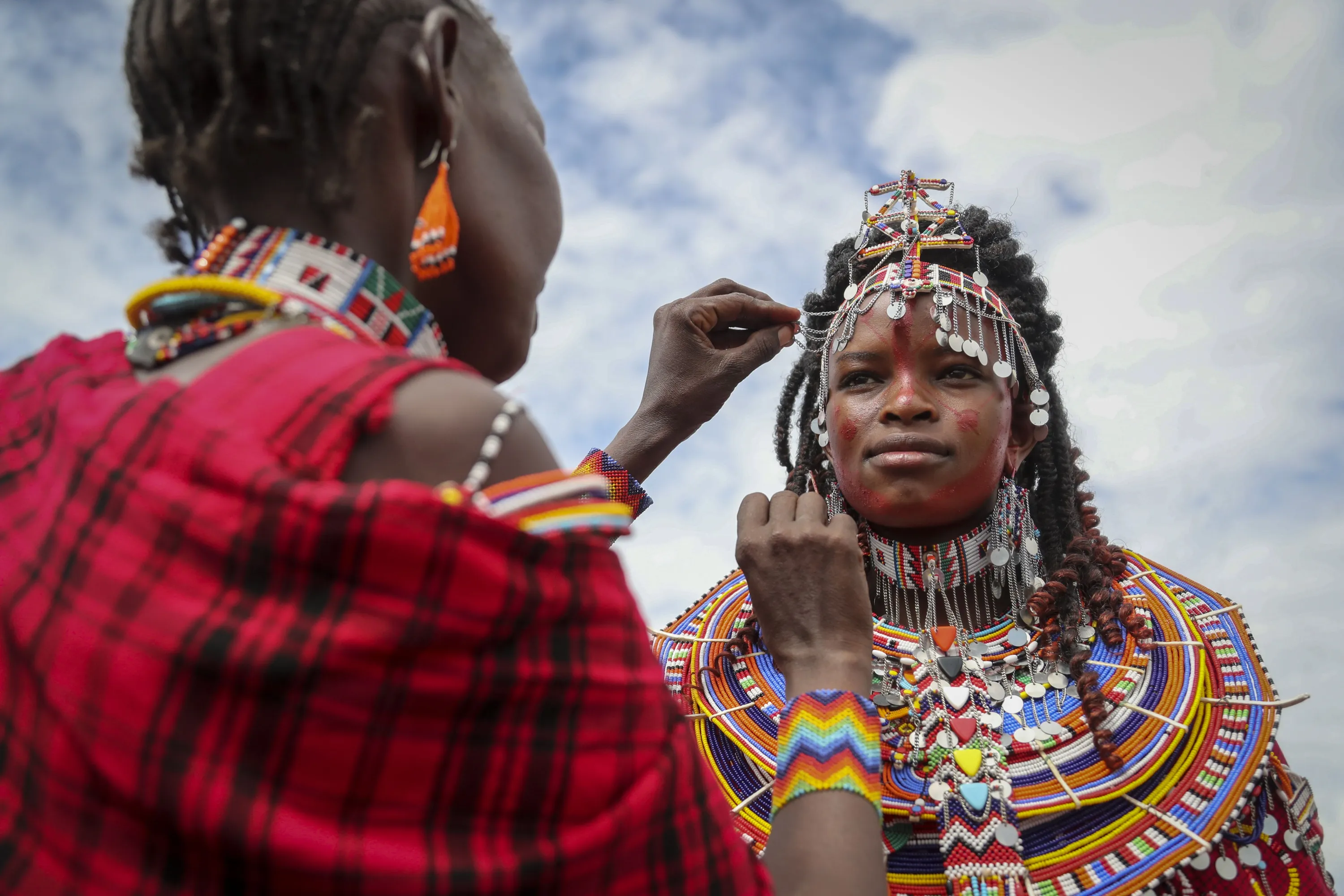 A Maasai woman adjusts the jewellery of another as they prepare to watch the Maasai Olympics in Kimana Sanctuary, southern Kenya Saturday, December 10, 2022. (Photo by Brian Inganga/AP Photo)