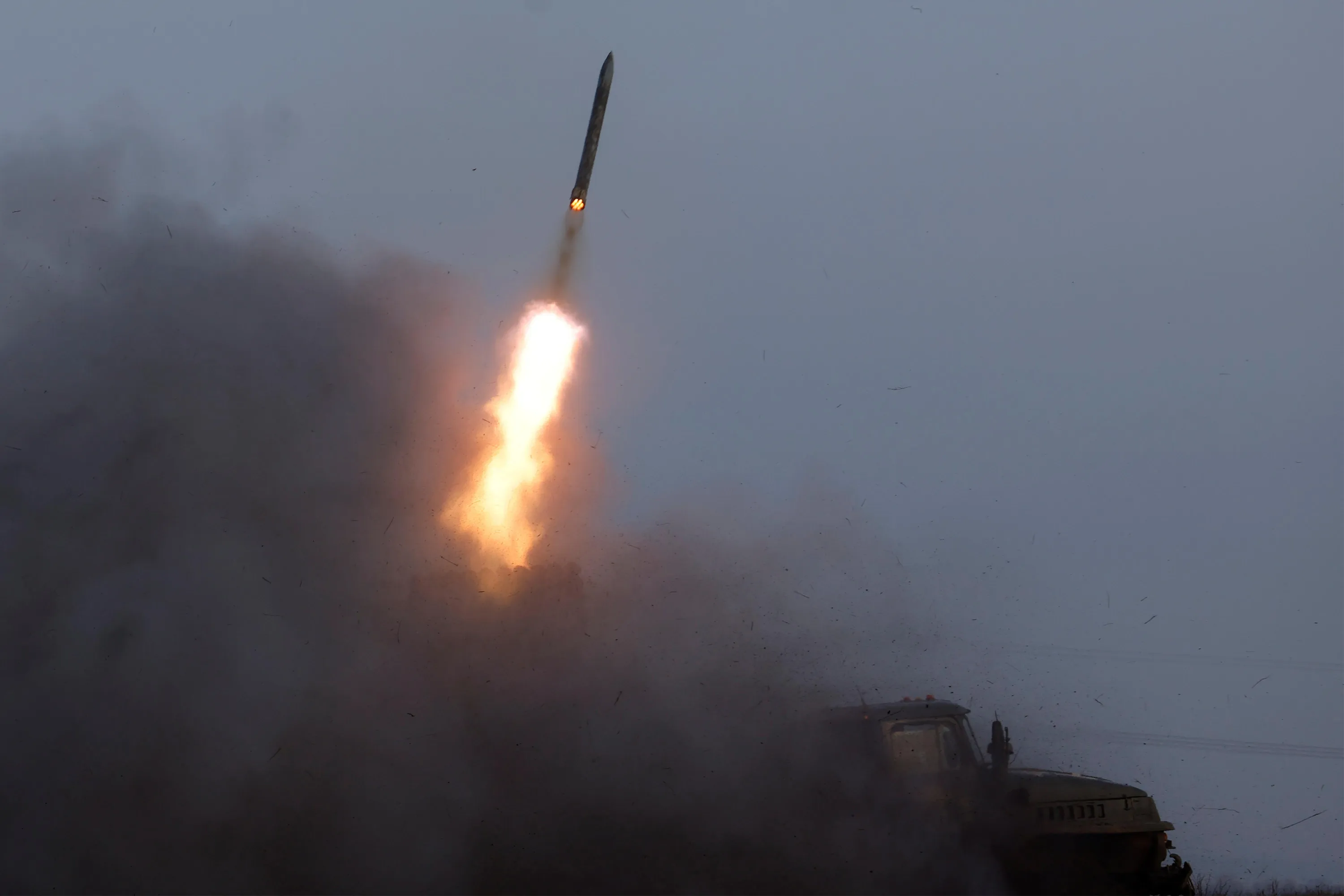 A Ukrainian BM-21 Grad multiple rocket launcher fires a rocket, as Russia's attack on Ukraine continues, during intense shelling on Christmas Day at the frontline in Bakhmut, Ukraine on December 25, 2022. (Photo by Clodagh Kilcoyne/Reuters)