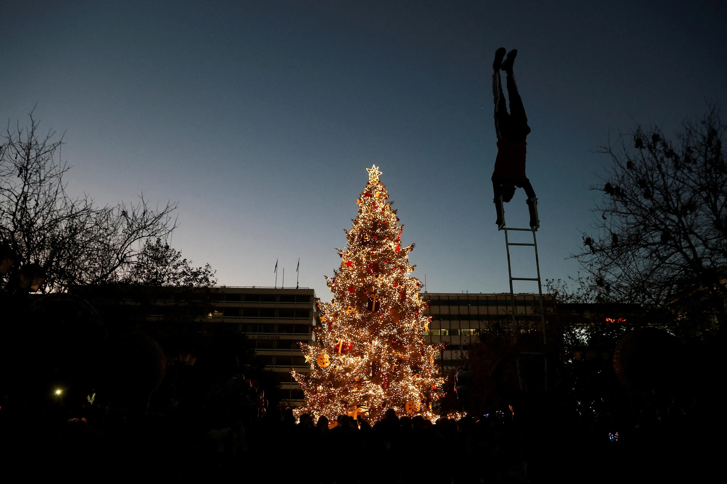 A street artist performs in front of the Christmas tree at Syntagma Square during Christmas festivities in Athens, Greece on December 25, 2022. (Photo by Costas Baltas/Reuters)