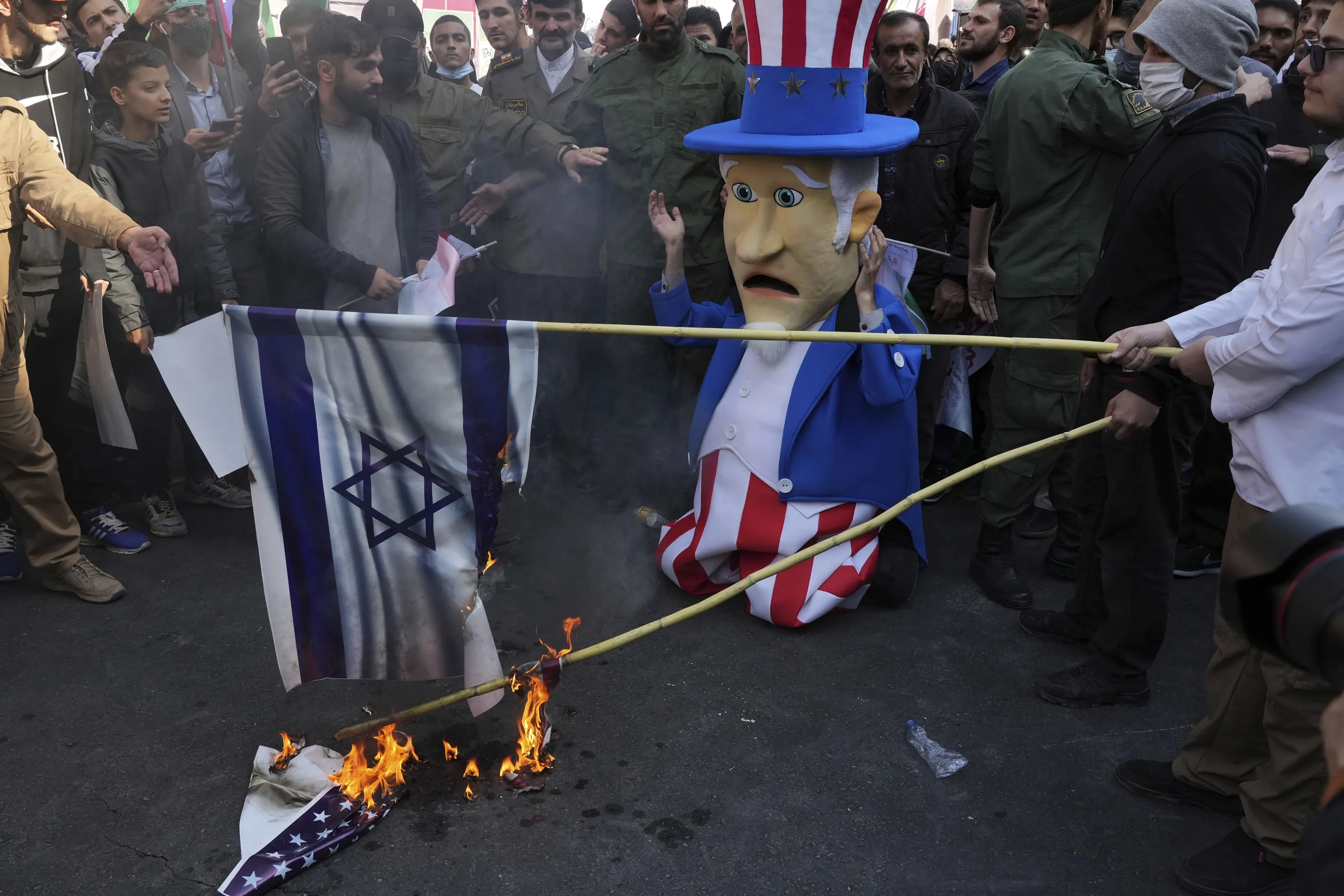 Iranians burn representations of the U.S. and Israeli flags as a man wearing Uncle Sam costume cries during annual demonstration in front of the former U.S. Embassy in Tehran, Iran, Friday, November 4, 2022. (Photo by Vahid Salemi/AP Photo)