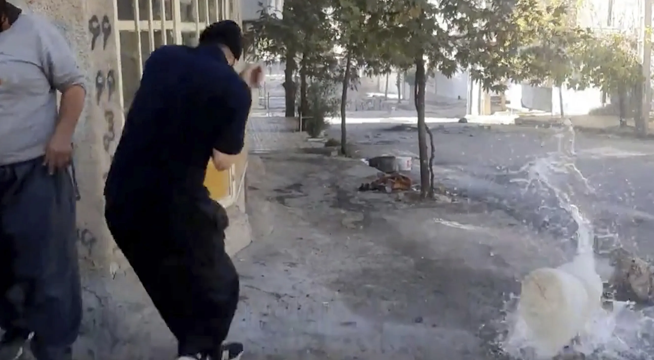 In this image from video provided by Hengaw Organization for Human Rights, a protester reacts after a water container was hit by a bullet during a protest in Javanroud, a Kurdish town in western Iran, Monday, November 21, 2022. (Photo by Hengaw Organization for Human Rights via AP Photo)