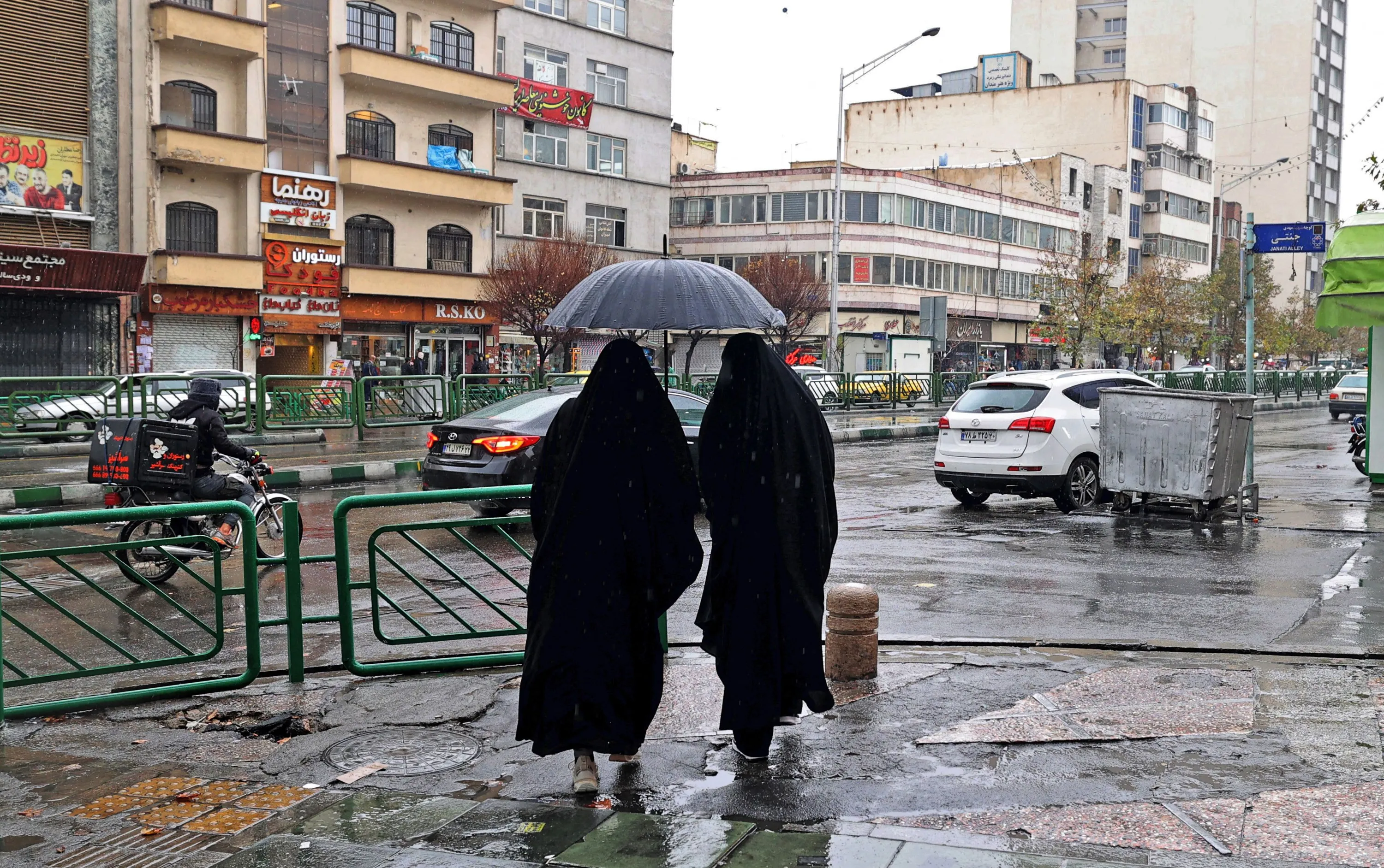 Women share an umbrella as they stand at Enghelab Square in Iran's capital Tehran on December 5, 2022. (Photo by Atta Kenare/AFP Photo)