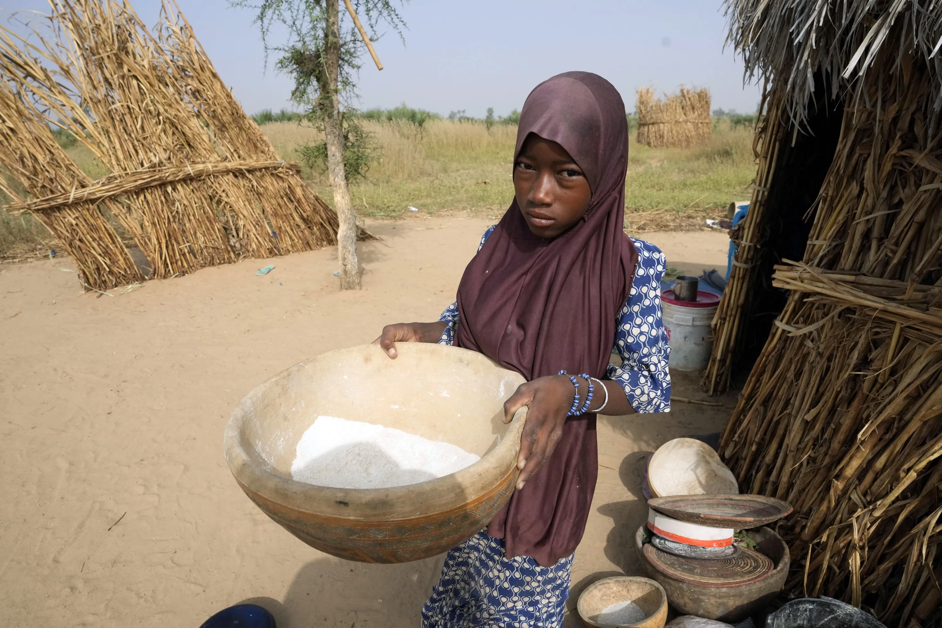 Husseina Ali, 9, daughter of Aisha Ali, carries food outside the hut where she found refuge from the floods in Darayami, northeastern Nigeria, Wednesday October 26, 2022. When floodwaters reached her hut made of woven straw mats and raffia palms, Aisha packed up what belongings she could and set off on foot with her eight youngest children. “While the flood was trying to destroy things, we were trying to save ourselves”, she said. Four of her children perished. (Photo by Sunday Alamba/AP Photo)