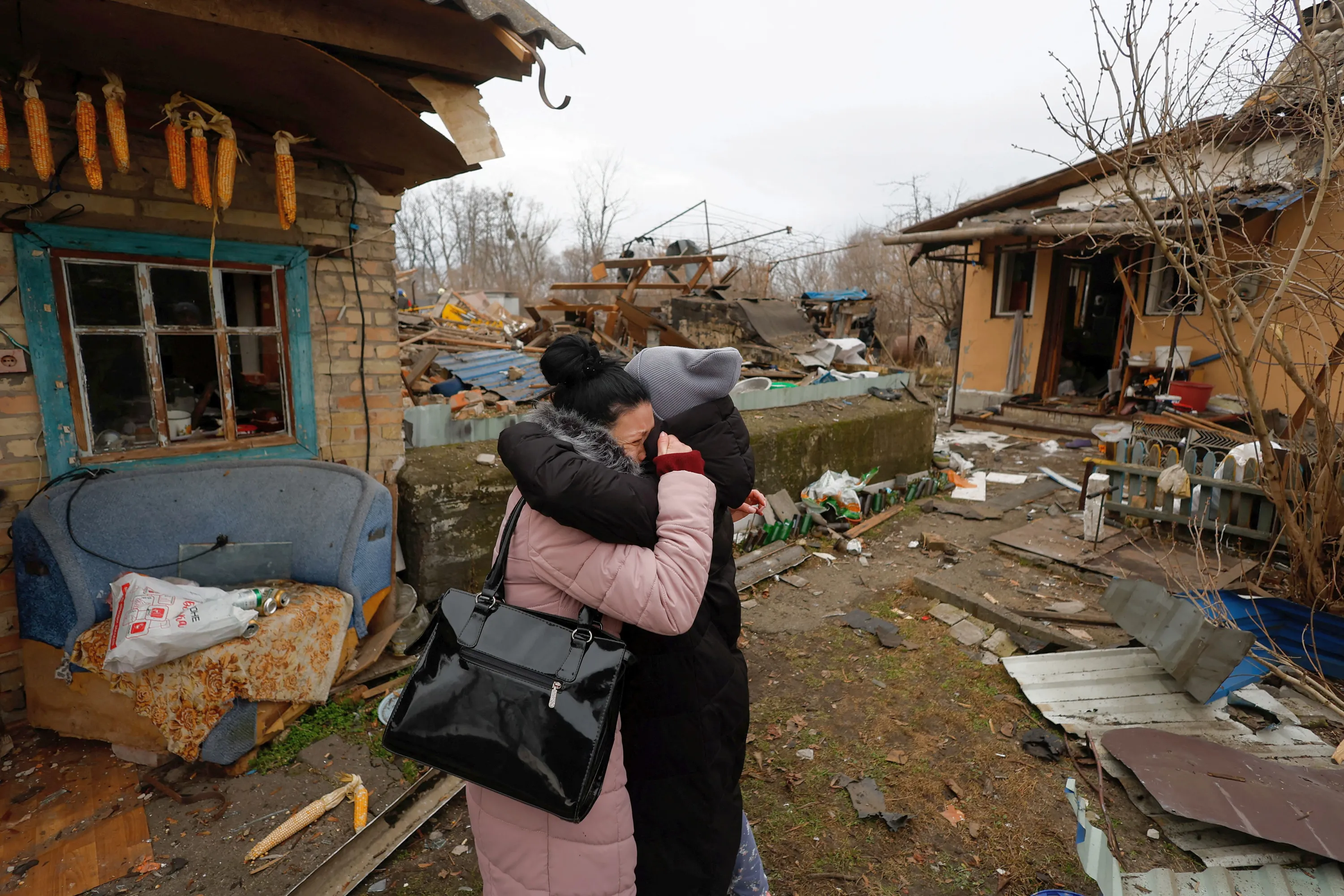 A local resident Yana embraces a friend as she reacts next to her mother's house damaged during a Russian missile strike, amid Russia's attack on Ukraine, in Kyiv, Ukraine on December 29, 2022. (Photo by Valentyn Ogirenko/Reuters)