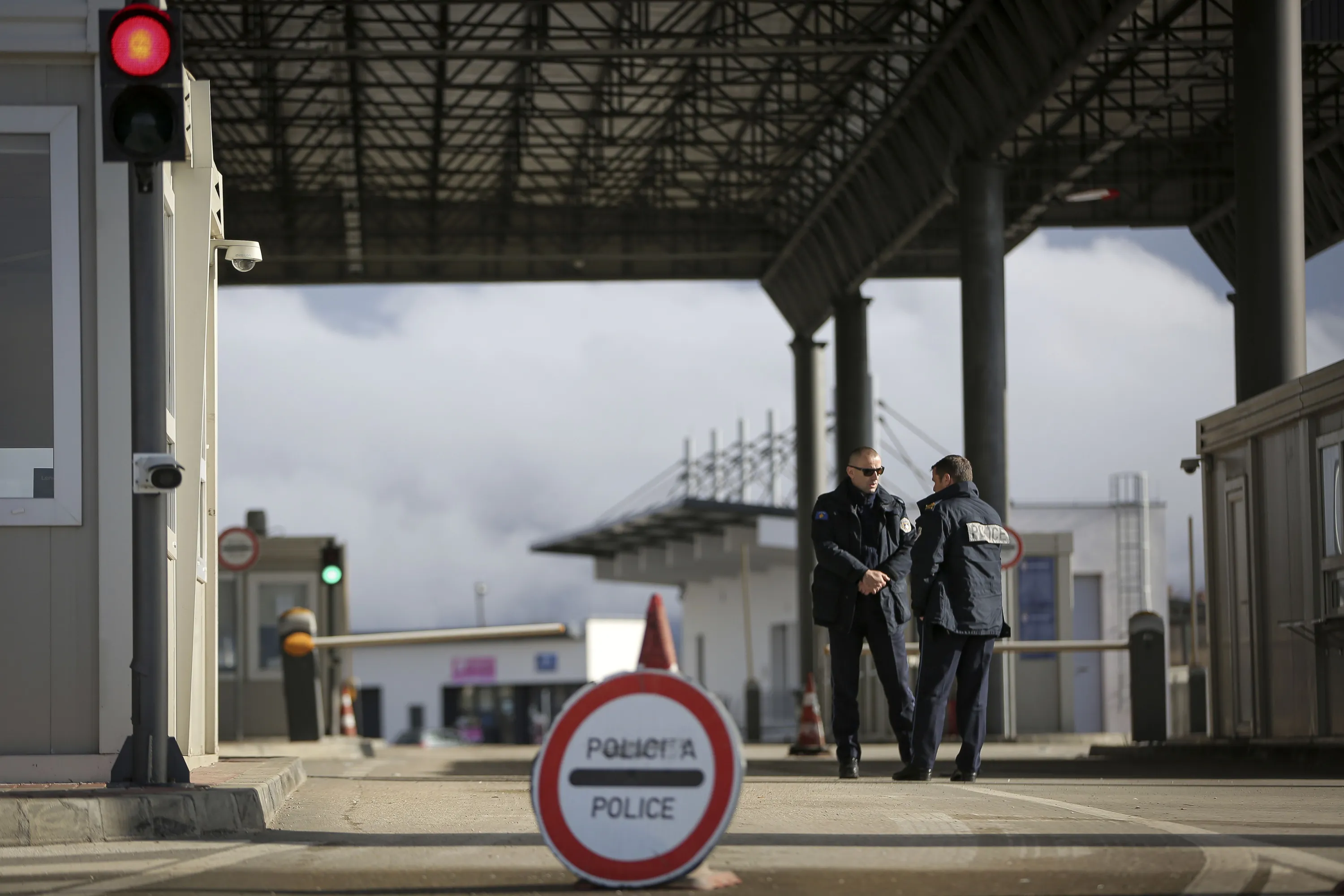 Kosovo police officers stand at the closed Merdare border crossing between Kosovo and Serbia on Wednesday, December 28, 2022. Kosovo closed the border crossing in Merdare, following an erected barricade by Serb protesters inside Serbia late Tuesday night, the third official border crossing closed this month following rising tensions between Kosovo and Serbia. (Photo by Visar Kryeziu/AP Photo)