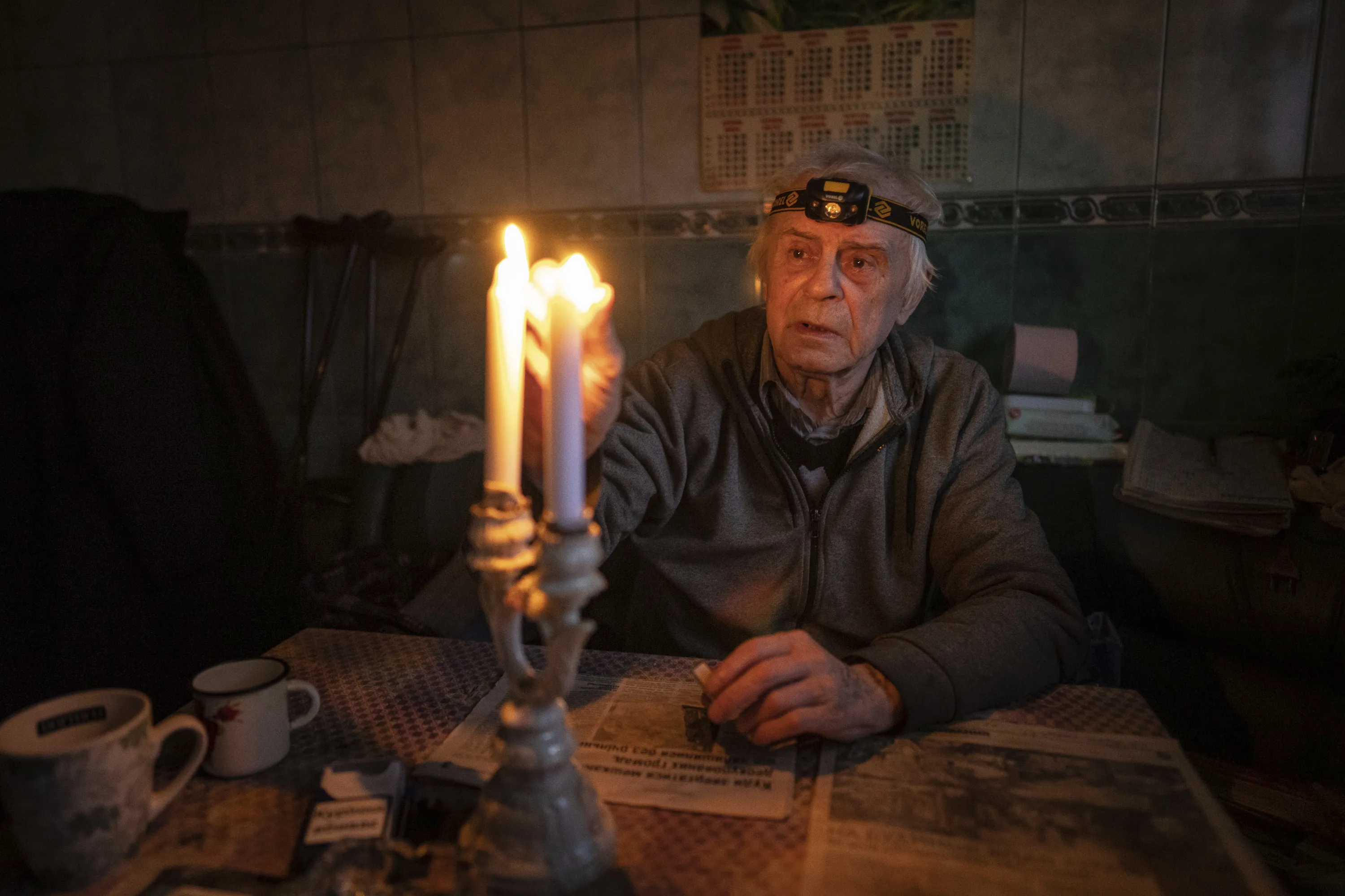Volodymyr Dubrovsliy, a disabled pensioner, lights candles in his house after living without electricity for more than four months in Kupiansk, Kharkiv region, Ukraine, Wednesday, December 28, 2022. (Photo by Evgeniy Maloletka/AP Photo)