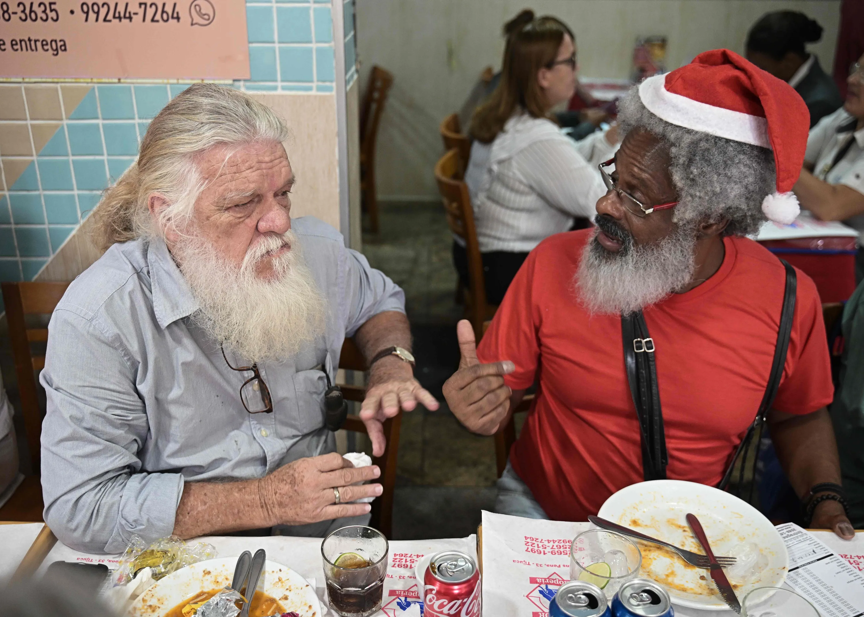 Professional Santas from Brazil's Santa Claus school talk during a Santa Claus reunion called “Barbas de Molho” (Beards at rest) at a restaurant in Rio de Janeiro, Brazil, on December 26, 2022. (Photo by Carl de Souza/AFP Photo)